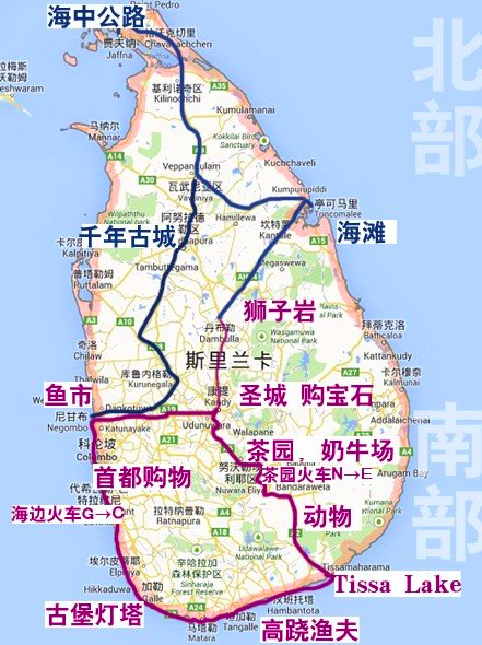 斯里兰卡国土面积不大,但北部因为内战刚平息不久且旅游资源相对贫乏,所以大部分人都会选择中部山区和西南海滨旅行。定下了从首都到中部文化三角再到南部海滩的顺时针小环岛路线:科伦坡-尼甘布--康提—努沃勒埃利耶—提瑟默哈拉默tissa— 美瑞莎-加勒—科伦坡,全程八天到十五天,这样从文化三角再到野生动物园再到海边基本上应有尽有。