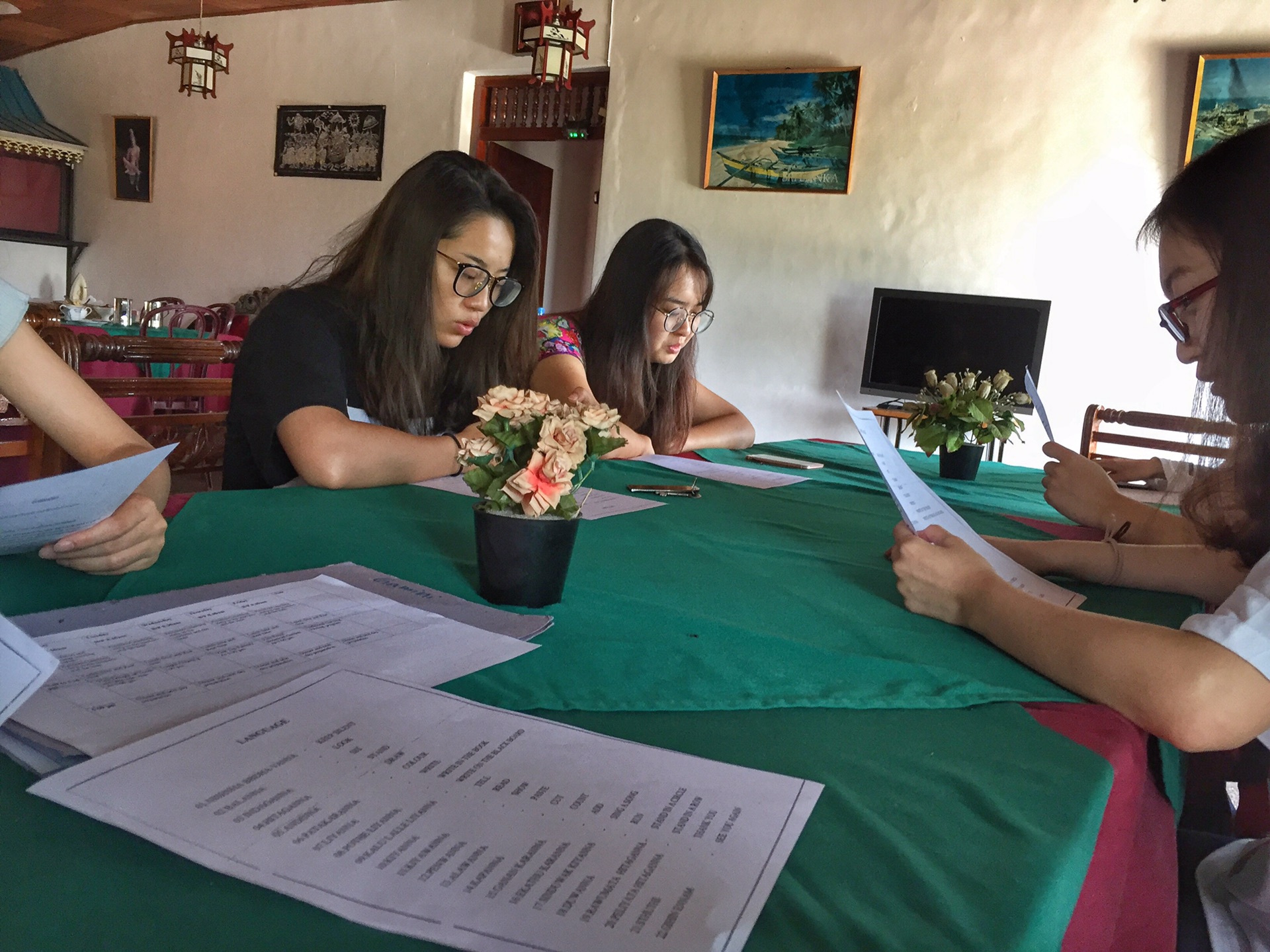 负责人一早餐完后大家还没来得及换衣服就开始教大家学习当地基本语言用词,大家十分兴趣认真读了一遍又一遍,