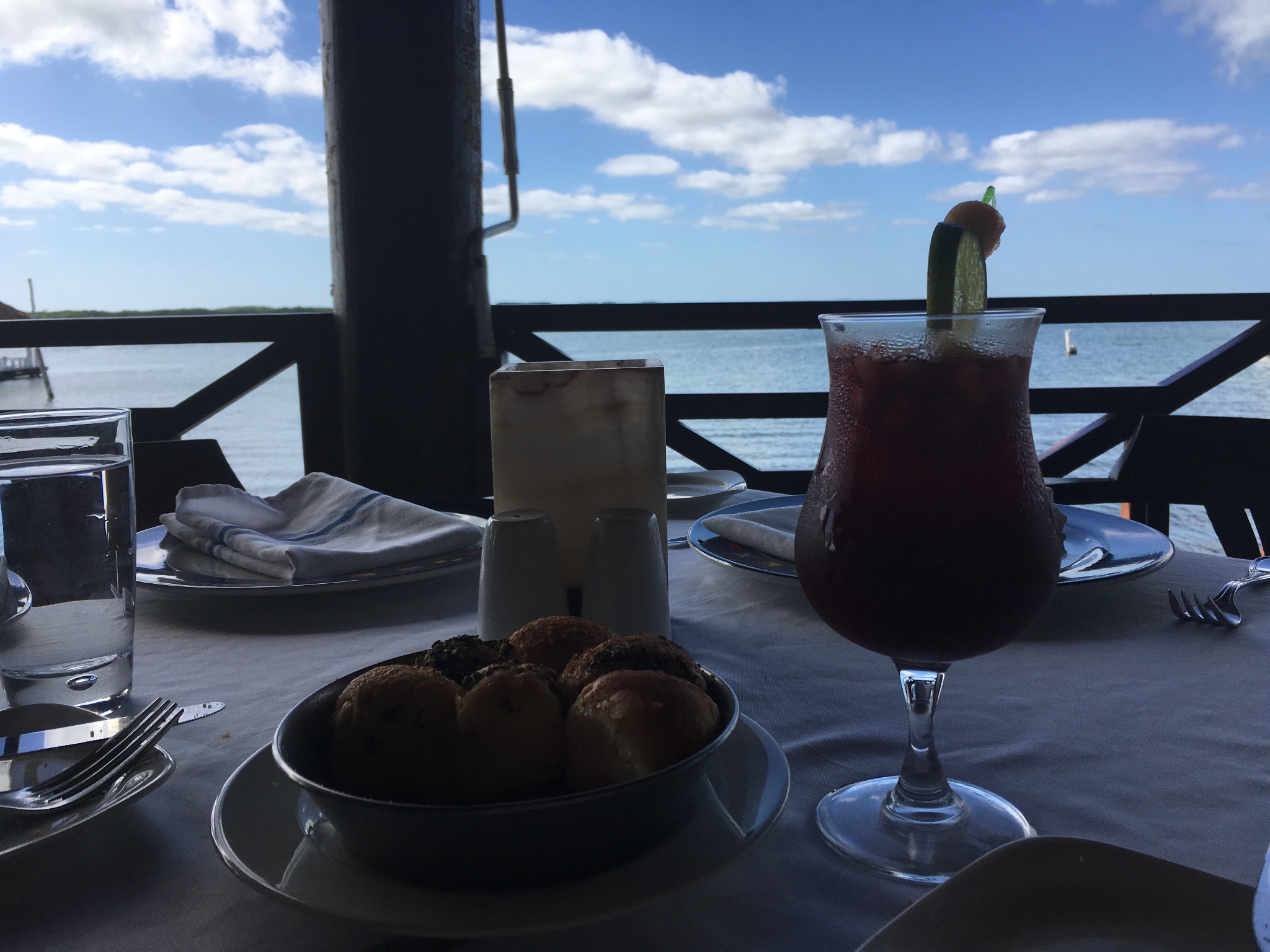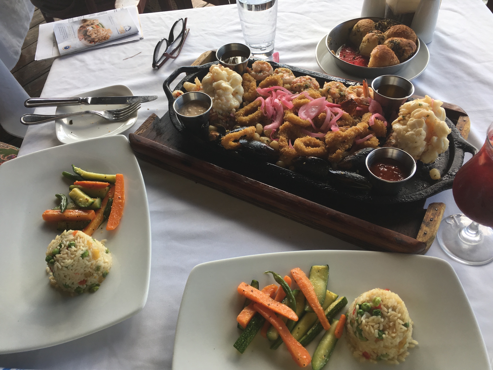 在岛国上有各式餐厅上百种,而我酒店外的Captain Cove可以算是其中海鲜类的翘楚。点了一盘海鲜大餐,包括两支龙虾,鱿鱼卷,鱼片和精心烹制的米饭与蔬菜,两人份大约65刀。配上一杯sangria,美妙的下午~