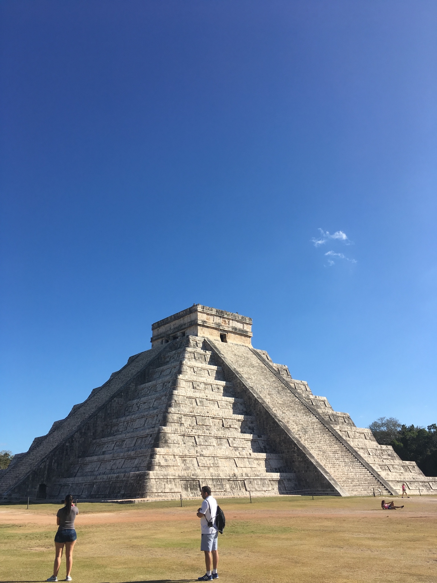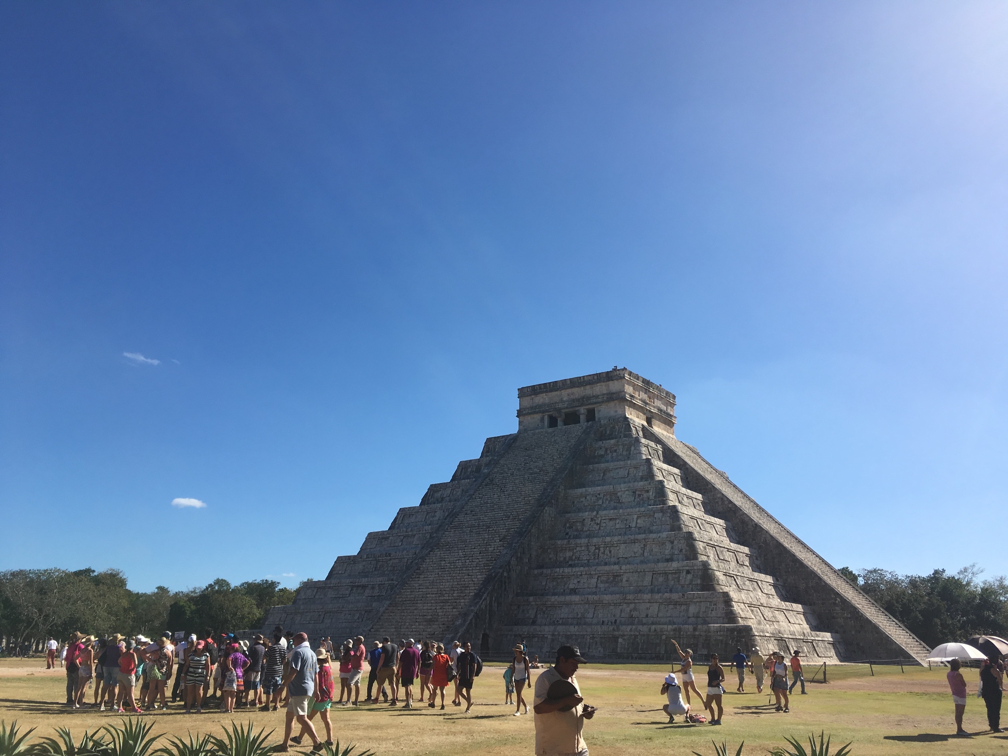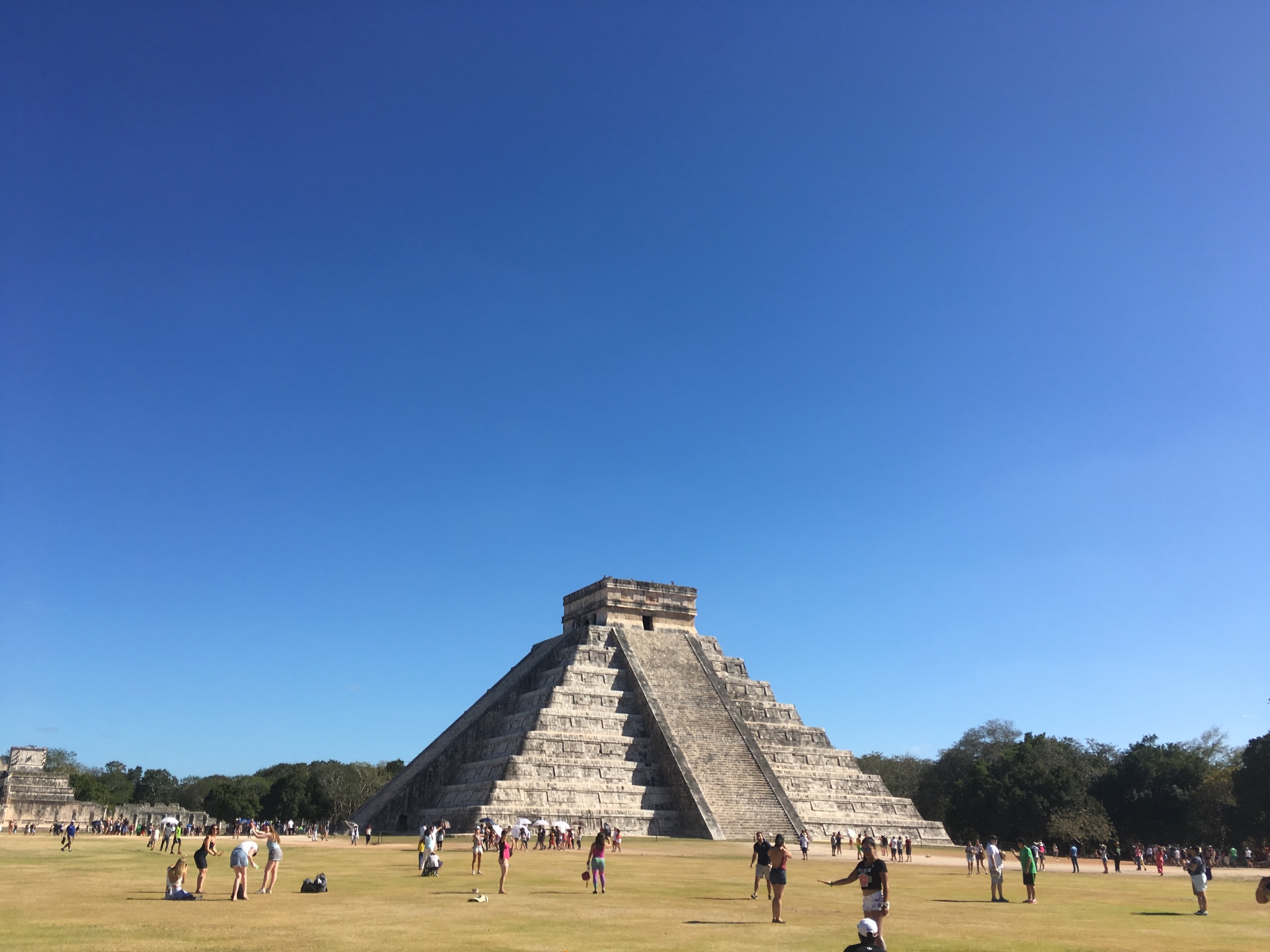 在奇琴伊察,导游向我们介绍这整个建筑群有上千座金字塔,然而墨西哥政府只维修了其中的几个比较著名的,包括卡斯蒂略金字塔,足球场以及用来祭祀的天坑。说起金字塔我们总会想到埃及金字塔,所以就联想奇琴伊察也是玛雅人的古墓吗?其实奇琴伊察完全就是玛雅人解释天地,人类起源,以及崇敬神明的一处祭祀之所。这里又让我想到人类文明的开始就在于神话,在于我们对自己身世的好奇和永无止境的探索。玛雅人也一样,他们对祭祀如此痴迷,就是因为他们相信自己是玉米的后代。