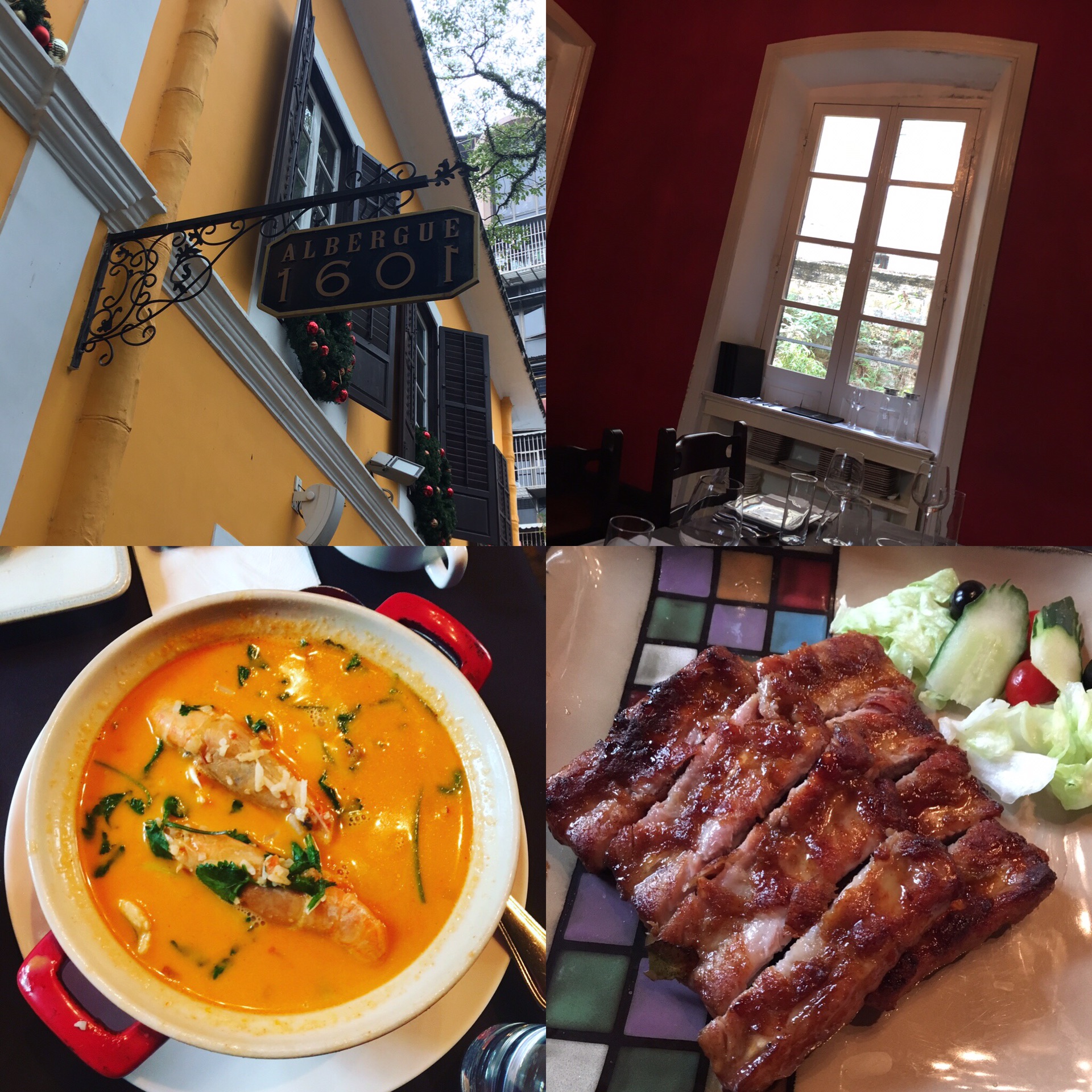 【ALBERGUE 1601】葡国餐厅,十二道味峰吃的那家葡国菜,感谢万能的网友扒出来的地址。这间位于疯堂斜巷的葡国餐厅,是鱼叔觉得目前在澳门吃的众多餐最好吃的,人均250葡币,小贵,但绝对物超所值。点了“海鲜烩饭”和“蜜汁猪仔骨”,在澳门吃方面不用担心,分量都特别足。味道真的超级好,海鲜烩饭完全强推,下次再去尝尝别的餐品。