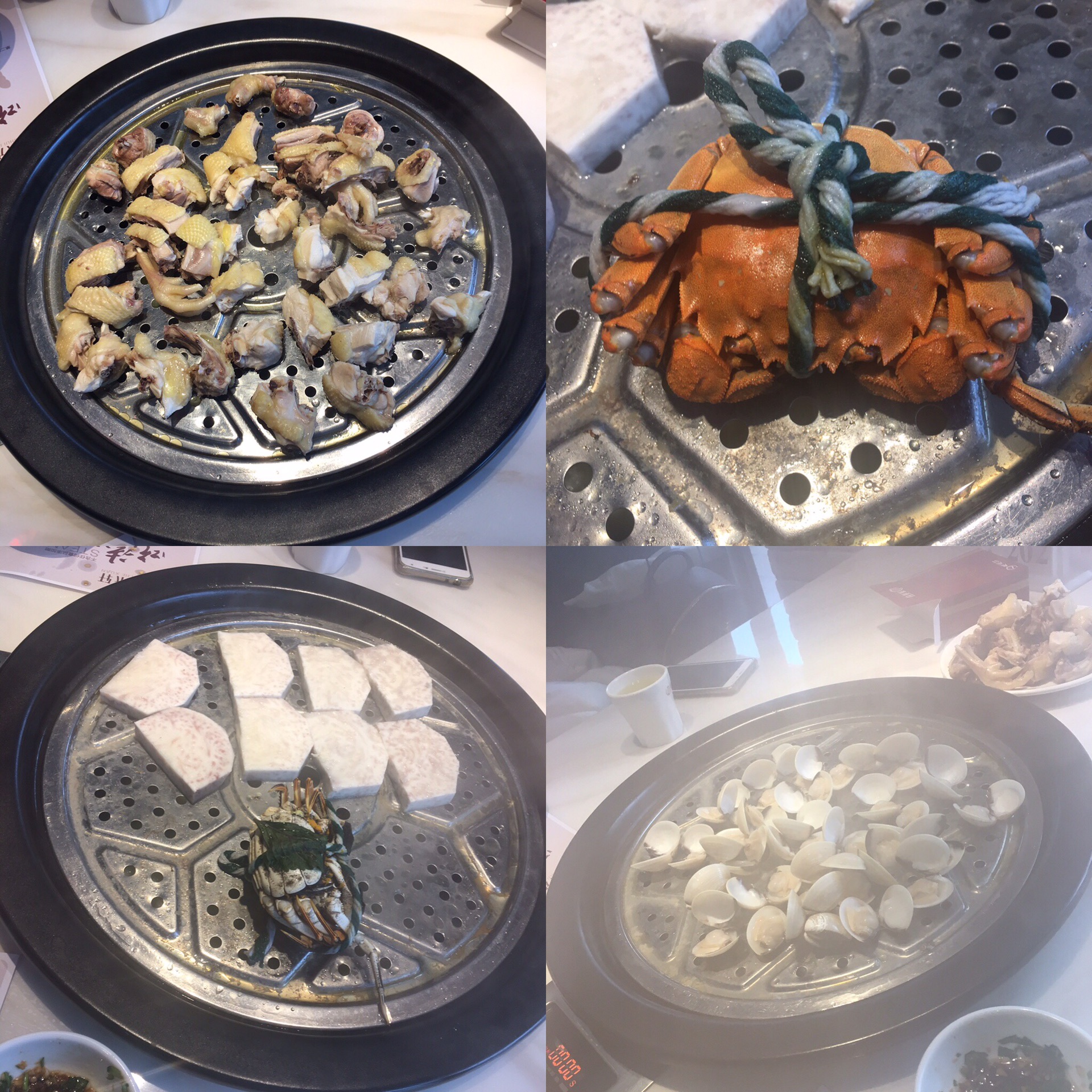 【蒸汽海鲜】先没有进关,而是在珠海吃了“蒸汽海鲜”。第一次吃这种形式的餐厅。先去点菜,我们点了:鸡肉、贝壳类、芋头、螃蟹、排骨粥,桌子中间有个蒸炉,服务员会帮你上盘蒸食材;把生米和排骨放在蒸炉底部,蒸出来的汁会漏到底部的粥里,粥特别鲜甜;根据个人口味,自己去调佐料。环境很好,食材很新鲜,分量也挺足的,味道很不错,两个女孩子吃的很满足。