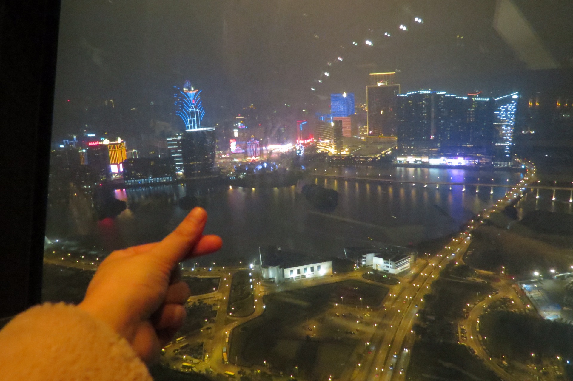 【旅游塔—澳门塔】在网上预约的票,相对现场买便宜很多。本来预计是5点多上搭,天气好的话顺便看日落和夜景,有时候时间和天气你很难掌控,你唯一能掌控的只有你的心情。上搭已经天黑了,天气不好能见度低,只能俯瞰一些灯红酒绿的澳门了。在室外观光层远眺,澳门赌场建筑都很个性,街道和马路也很有趣。澳门塔有著名的娱乐项目:空中漫步、百步登天、笨猪跳、空中飞人等,胆子小一点站在观光层都够呛,总有一天我会蹦极和Skydive的,但不是今天......恰逢有游客在玩空中漫步,除了享受高空的美景、高空带来的刺激、更多的是享受自由吧。