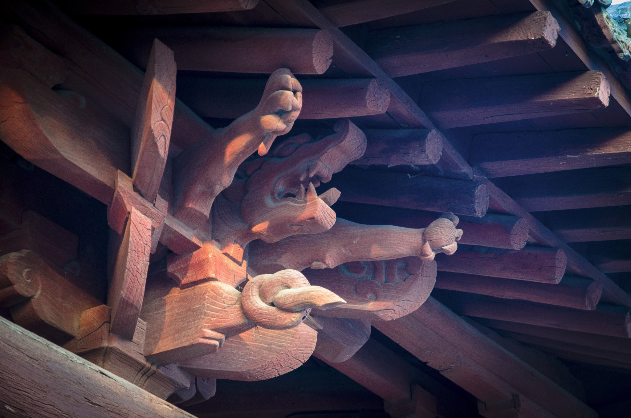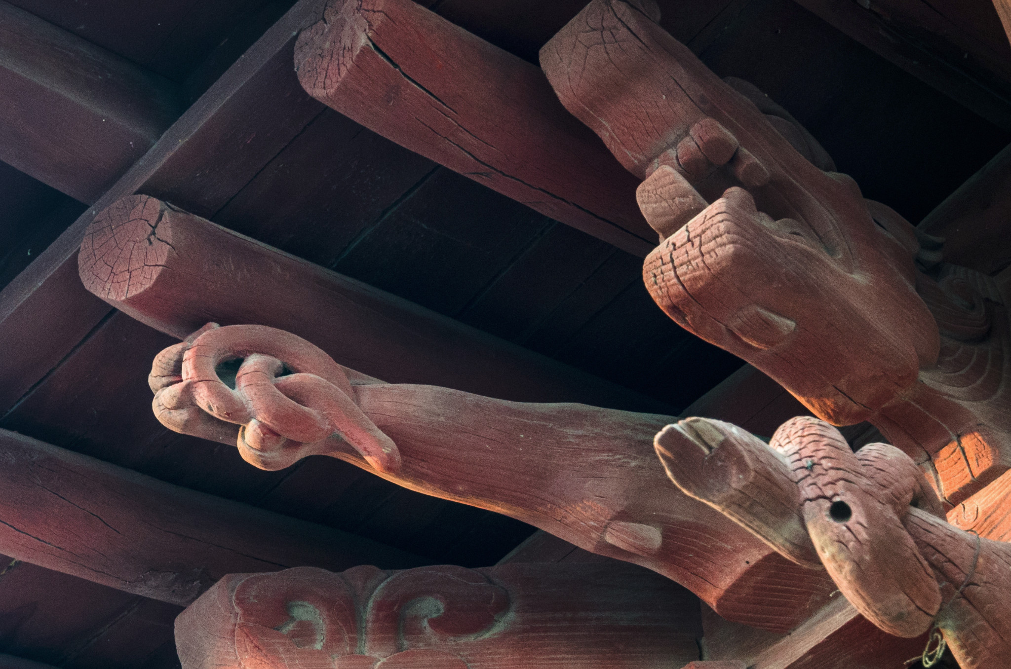 栌斗出象鼻形华拱,竟然系个扣,还是死结,其上置散斗,龙首长吟、一爪握珠、一爪握啥捏?