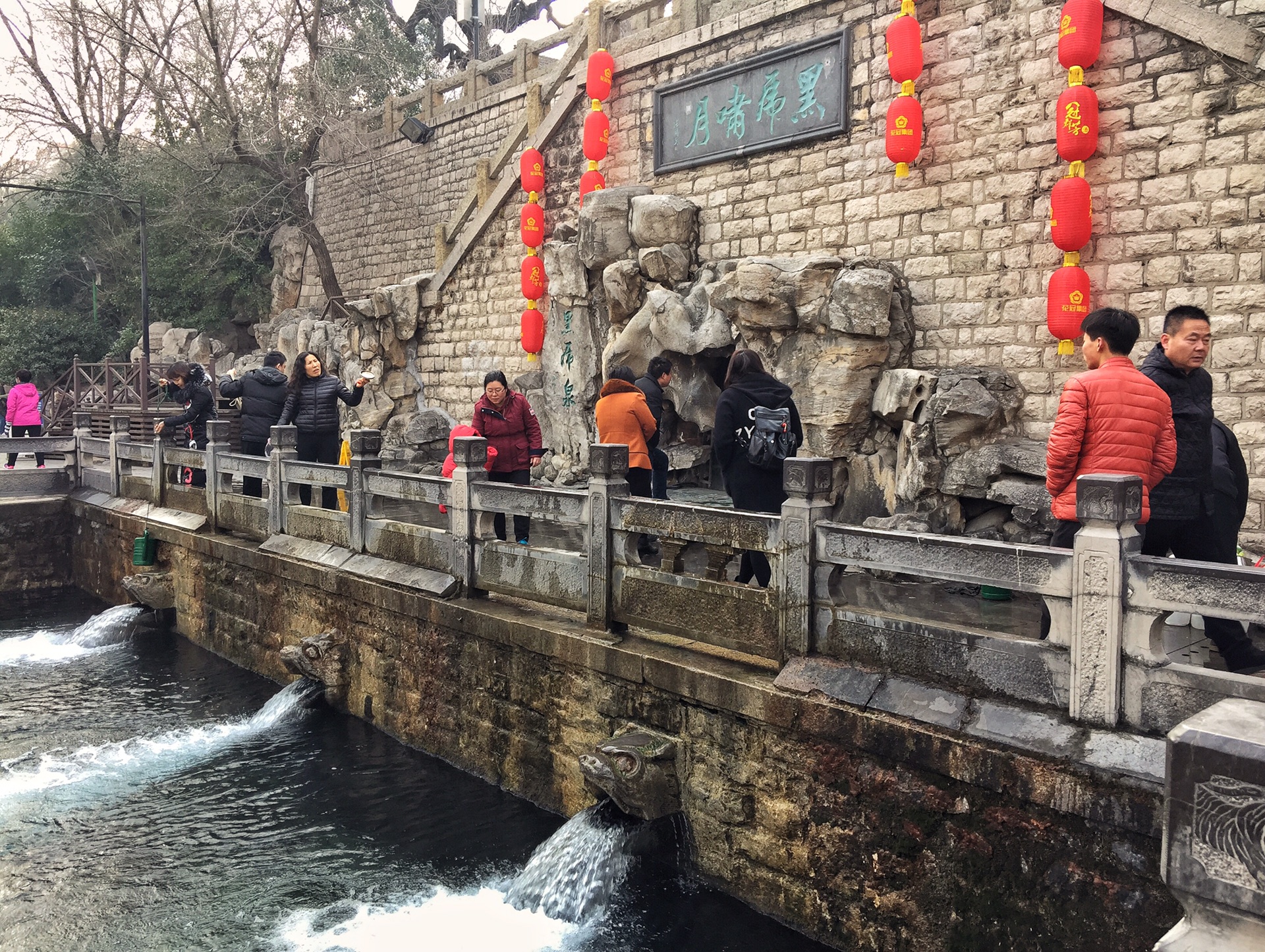 大年初五,我们在酒店吃过早餐后,步行至黑虎泉。黑虎泉位于济南市历下区解放阁南护城河南岸,为天下第一泉5A级风景区的三大泉群之一。涌水量在济南诸名泉中仅次于趵突泉,居第二位。早在金代以前,黑虎泉就以现名闻名于世。泉水出于深凹形洞穴,通过三个石雕虎头泉水喷出,波澜汹汹,水声喧喧。