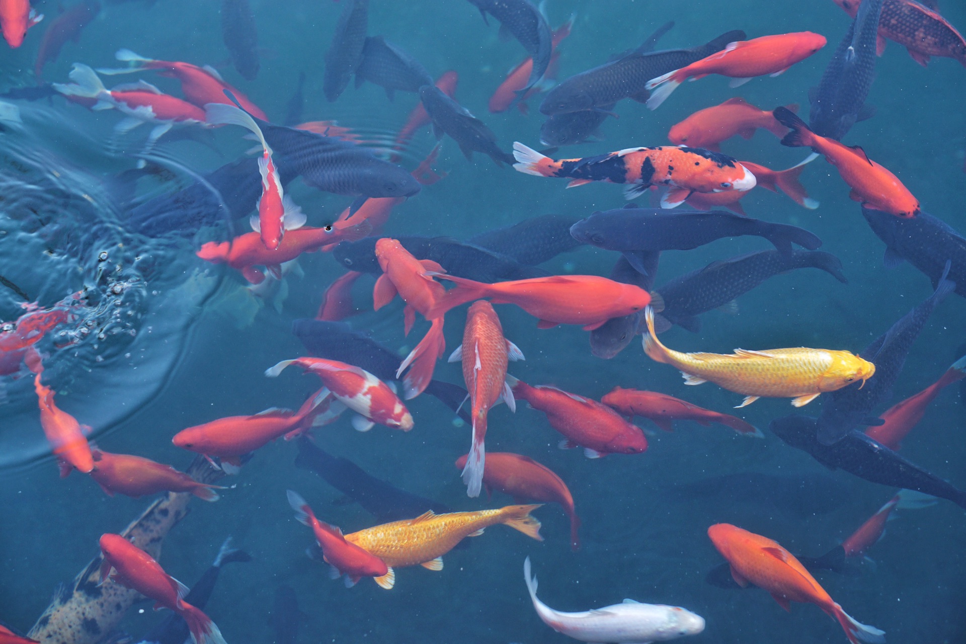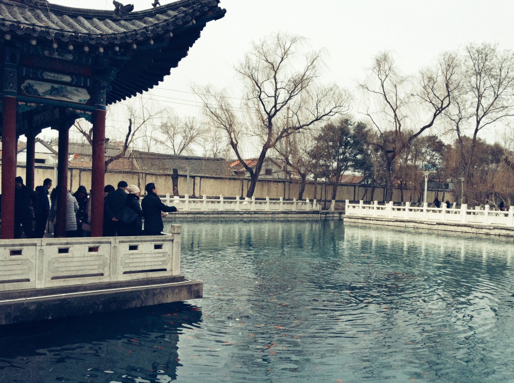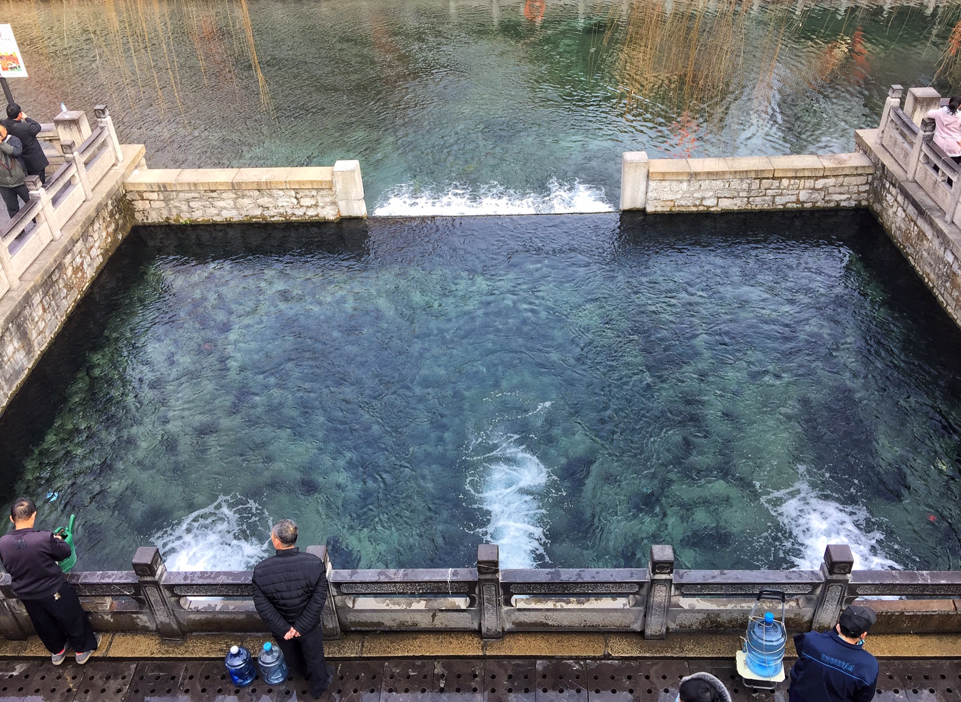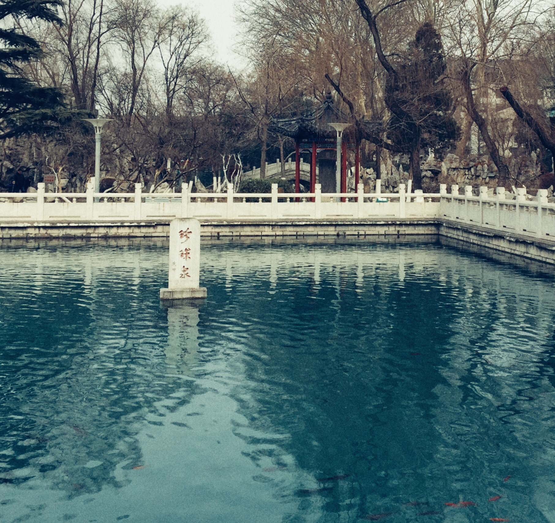 潭中泉水清澈透明,微微泛出青色。一群群锦鲤在潭中游来游去,惹得岸边游人依栏争相投喂潭中锦鲤,激起潭水一片片涟漪。