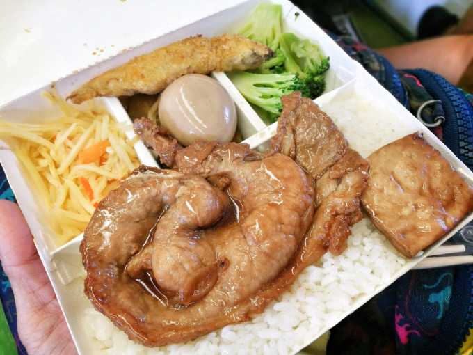 台铁便当在车上,以及每一个车站都有得卖,可以买好了带上车,也可以在车上直接买!以下这个是大的排骨饭,80元台币,不过十多元人民币,他们的排骨类似于我们的猪扒,很嫩而且多汁,比我们和谐号上的好吃一万倍~黄色的是笋,超级好吃!!!坐台铁,一定要吃铁路便当哦~