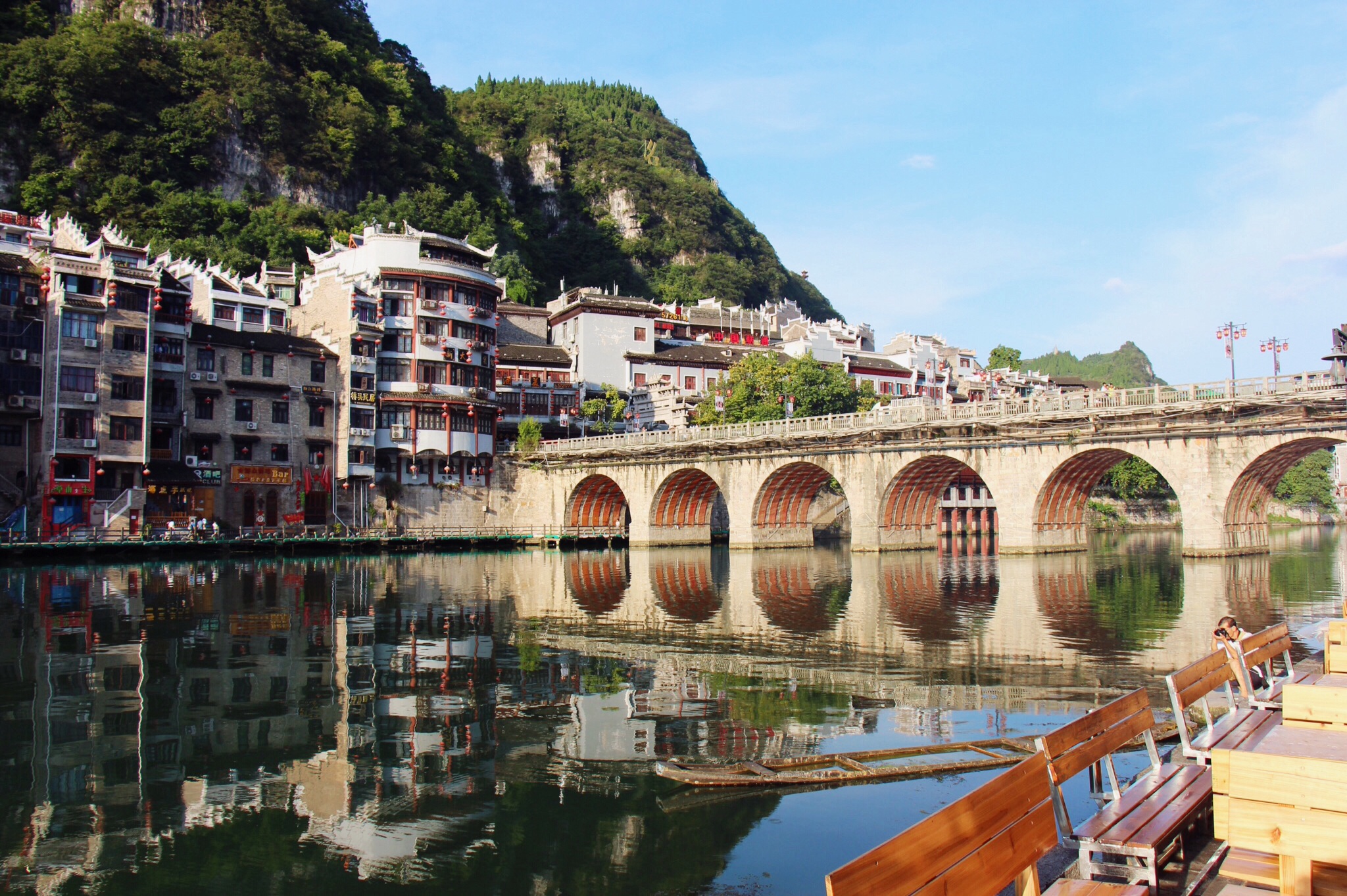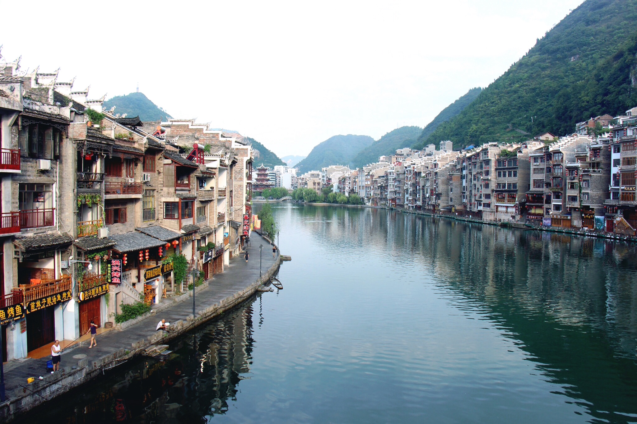 镇远,是贵州省黔东南苗族侗族自治州镇远县名镇,位于舞阳河畔,四周皆山。河水蜿蜒,以“S”形穿城而过,北岸为旧府城,南岸为旧卫城,远观颇似太极图。两城池皆为明代所建,现尚存部分城墙和城门。素有"滇楚锁钥、黔东门户"之称。镇远城东的青龙洞,是一组规模极其宏大的明清宗教建筑群,其间既有佛教寺庙,又有道教宫观和儒家祠庙,三教合一,蔚为壮观。此外,沿舞阳河畔还有天后宫、吴王洞、石屏山、铁溪等旅游景点。