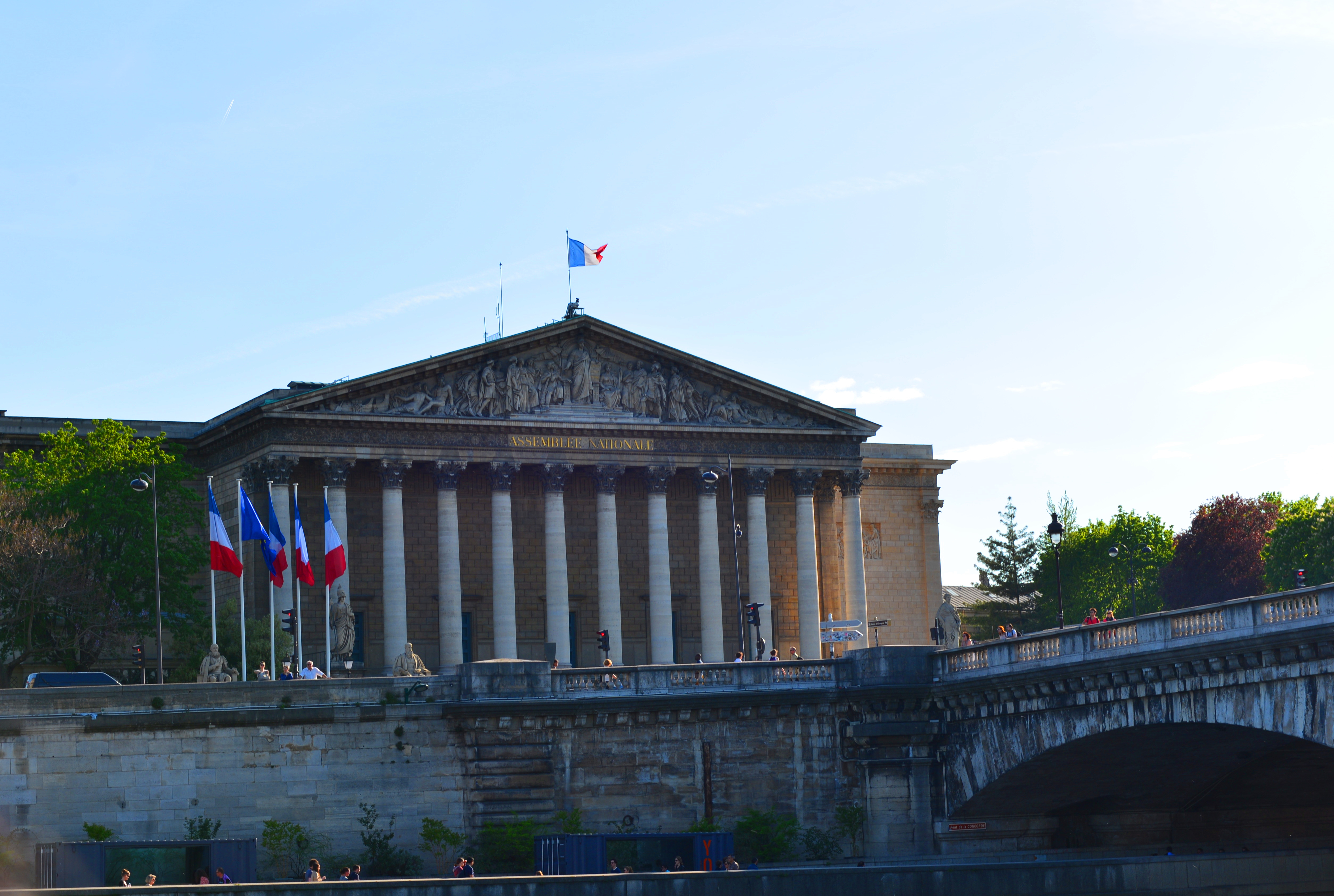 波旁宫是座具有260多年历史的古典建筑,现为法国国民议会(Assemblee Nationale)所在地,坐落在法国巴黎塞纳河南岸。这座半圆形大厦规模雄伟,北门12根大圆石柱组成的宽阔柱廊,承托着一个三角形横楣,上面饰以通体浮雕,柱廊下的30级台阶两侧有6尊雕像。它是1722年为路易十四的女儿波旁公爵夫人建的王府,并由此得名。原是国王路易十四的女儿波旁公爵夫人的,1789年以后,波旁宫差不多一直是法国最高立法机构的所在地,当作是法国法律的象征。1830年起用作国民议会,拿破仑当皇帝时把它临塞纳河一面改成柱式门面,以便与河对岸雅典风格的玛德莱娜教堂遥相呼应。