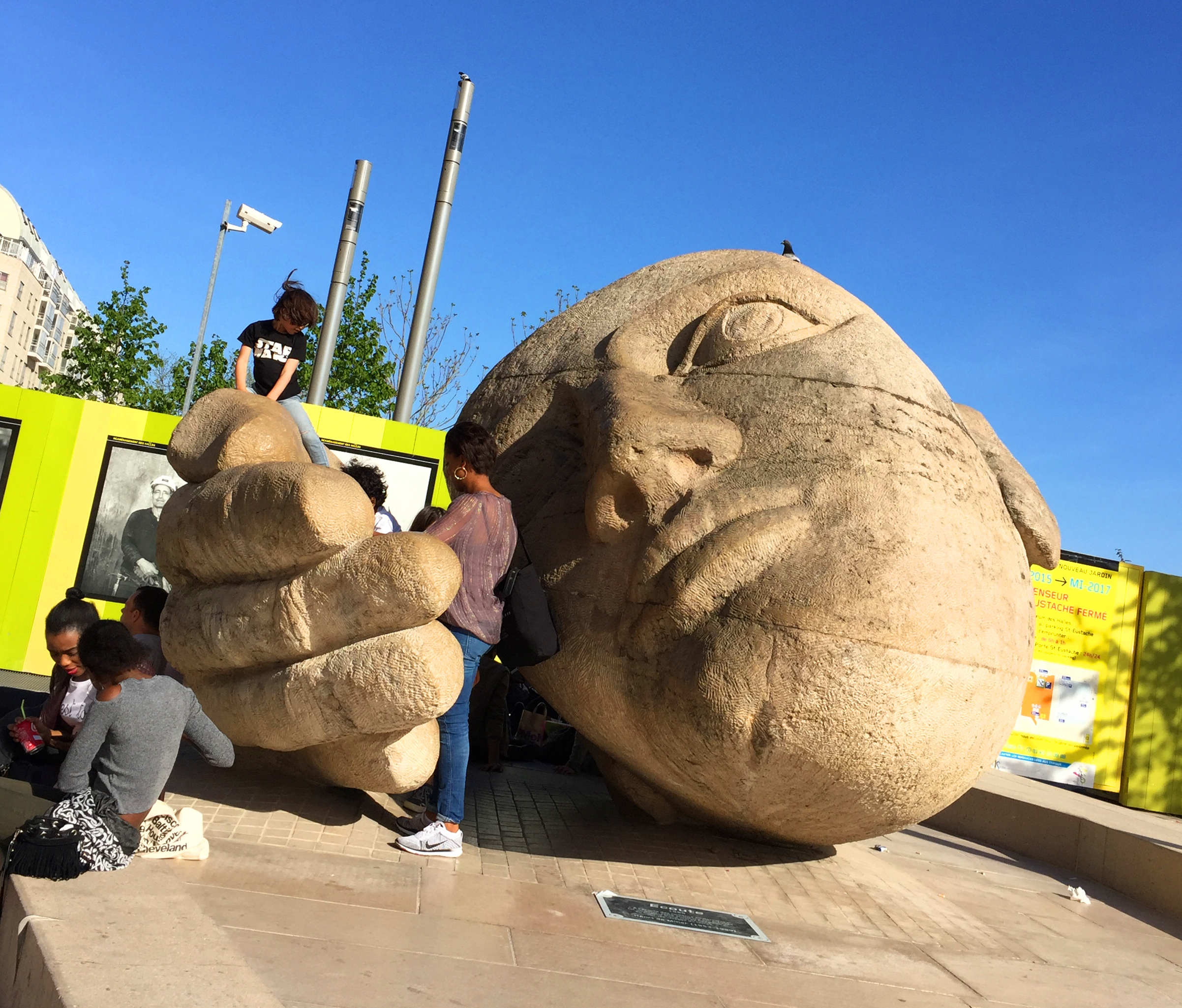 我们是从教堂侧门进入教堂的,从教堂前门出来后是个小广场(纳尔逊曼德拉花园),很多人在此休闲,晒着太阳。广场上米勒的雕塑“倾听”,成了很多游客和小朋友的大玩具。