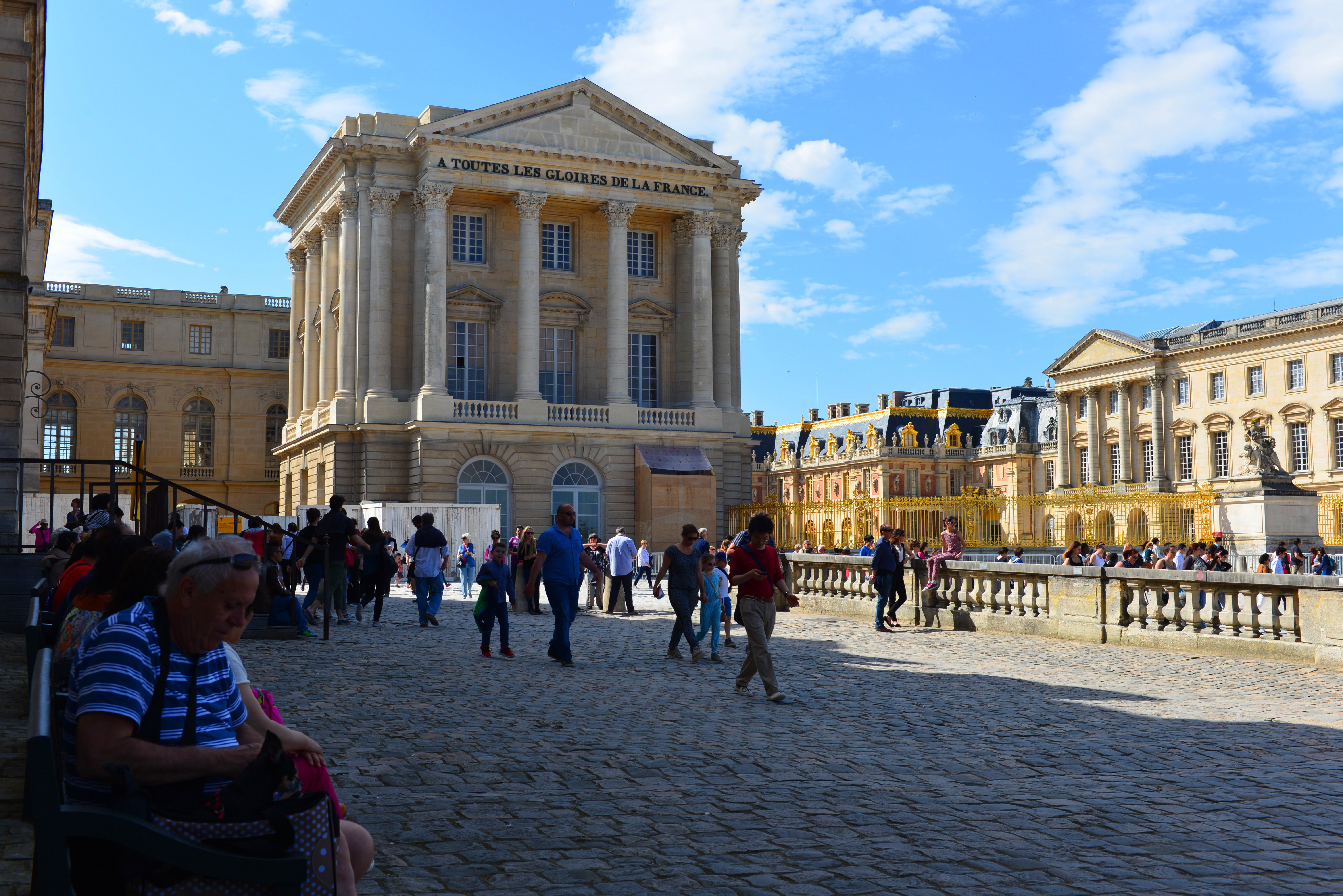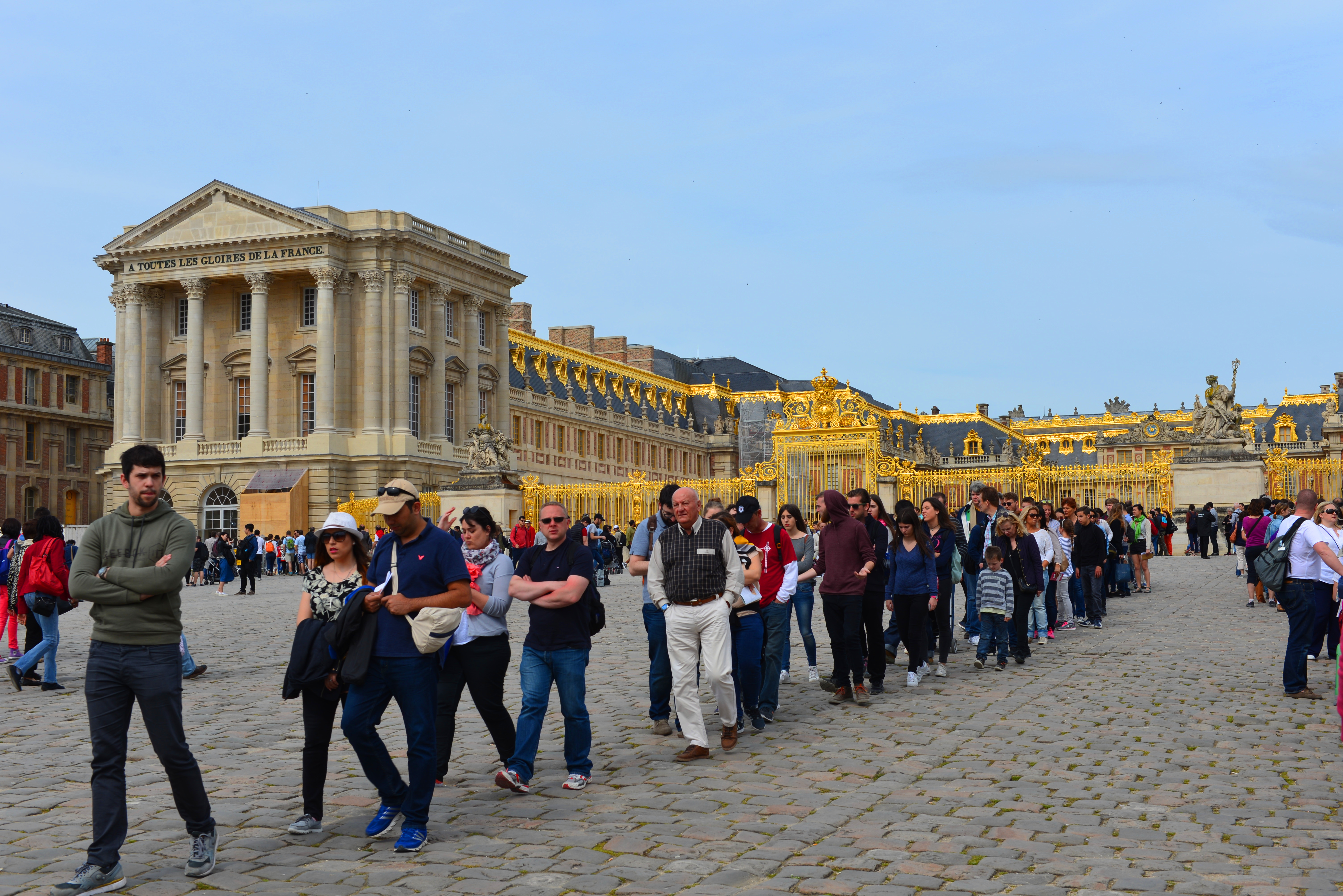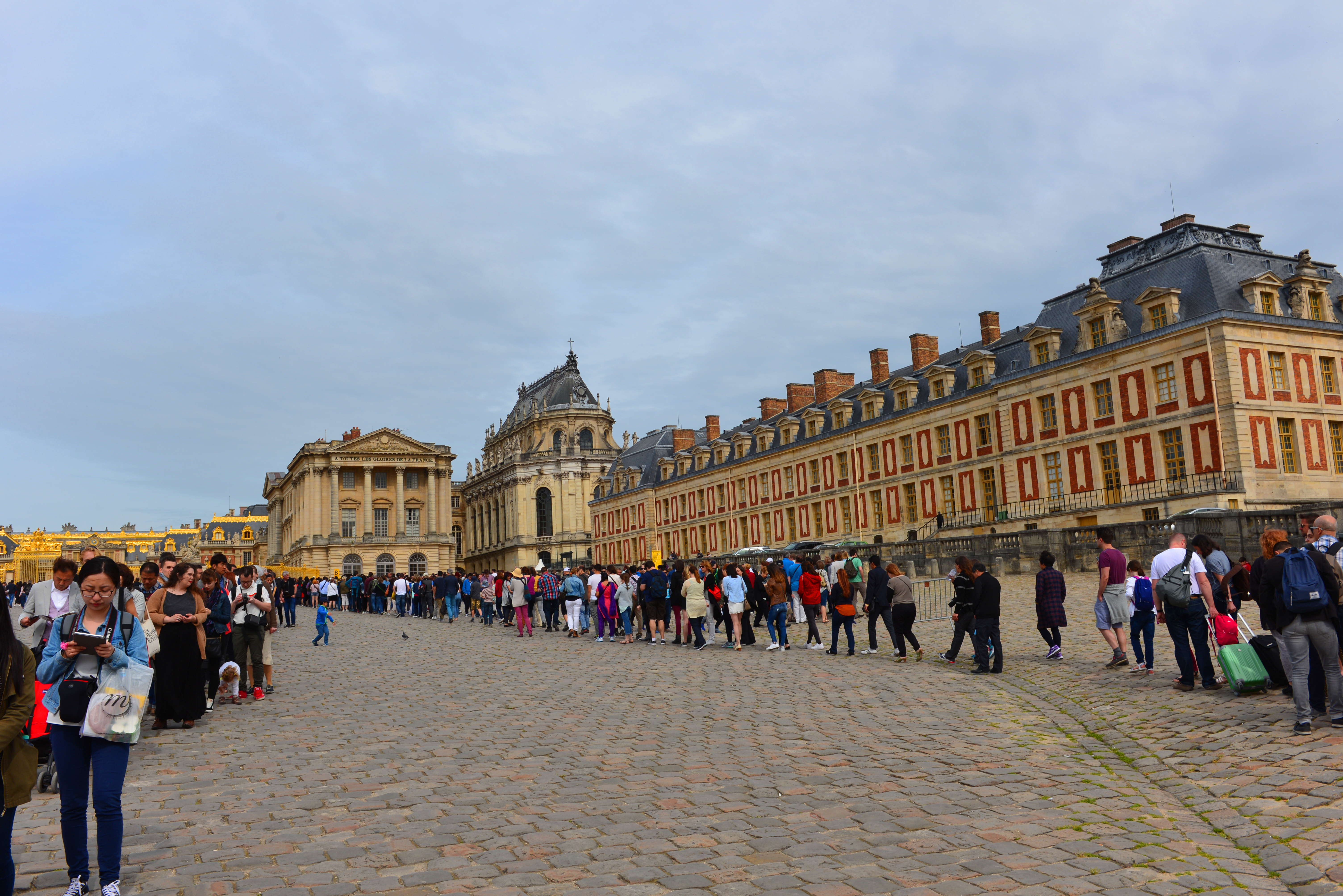 早上游客很多,我们9:30前赶到凡尔赛宫,看到购票和入宫的队伍都很长,于是我们三个人进行了任务分工:夫人和女儿去排队买票,我则去排入宫队伍。购票和入宫一共用了近1个小时的时间。我们买的是通票(包括大型音乐喷泉表演,游览凡尔赛宫、大小特里亚侬宫和玛丽-安托瓦内特宫苑),价格25欧/人。