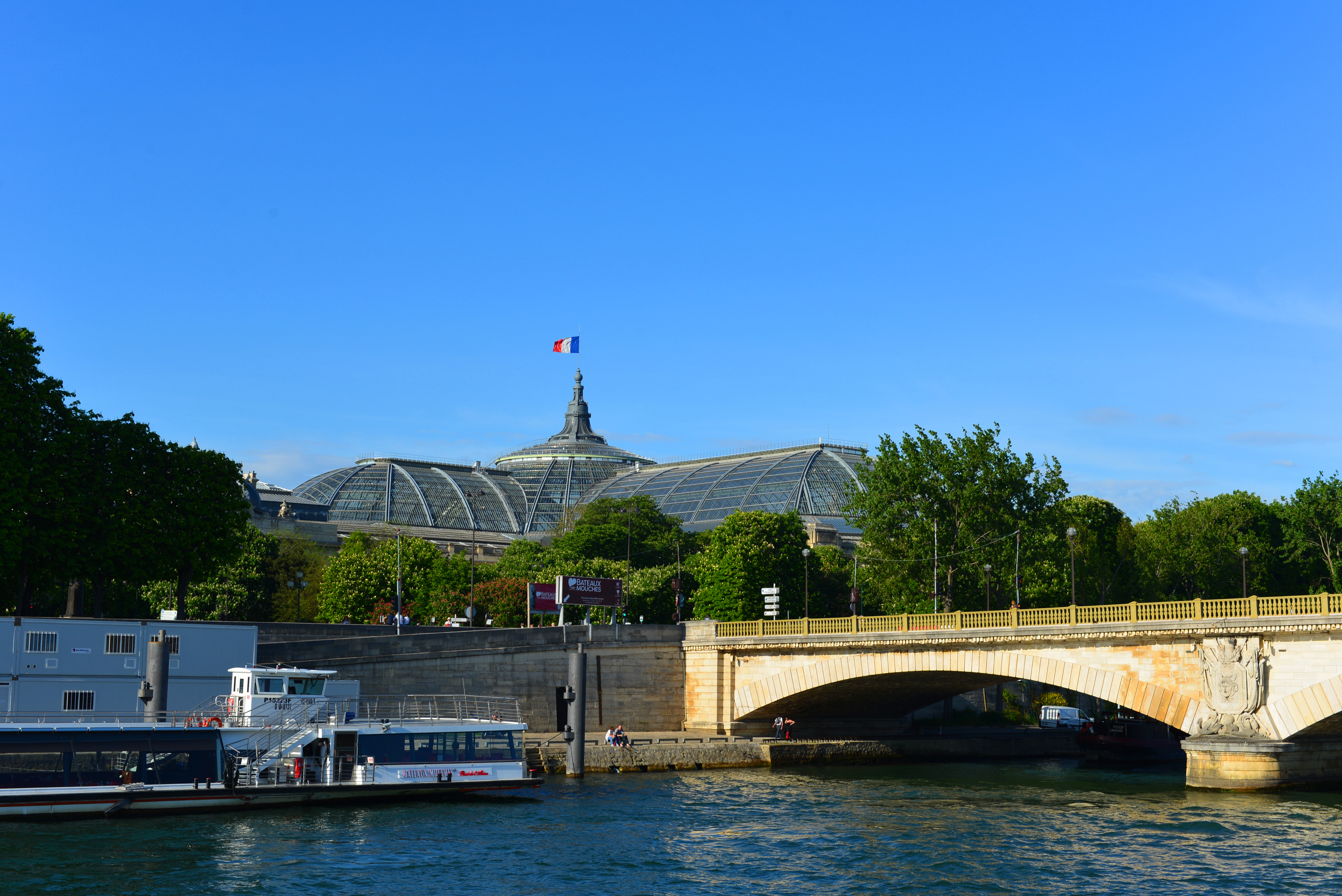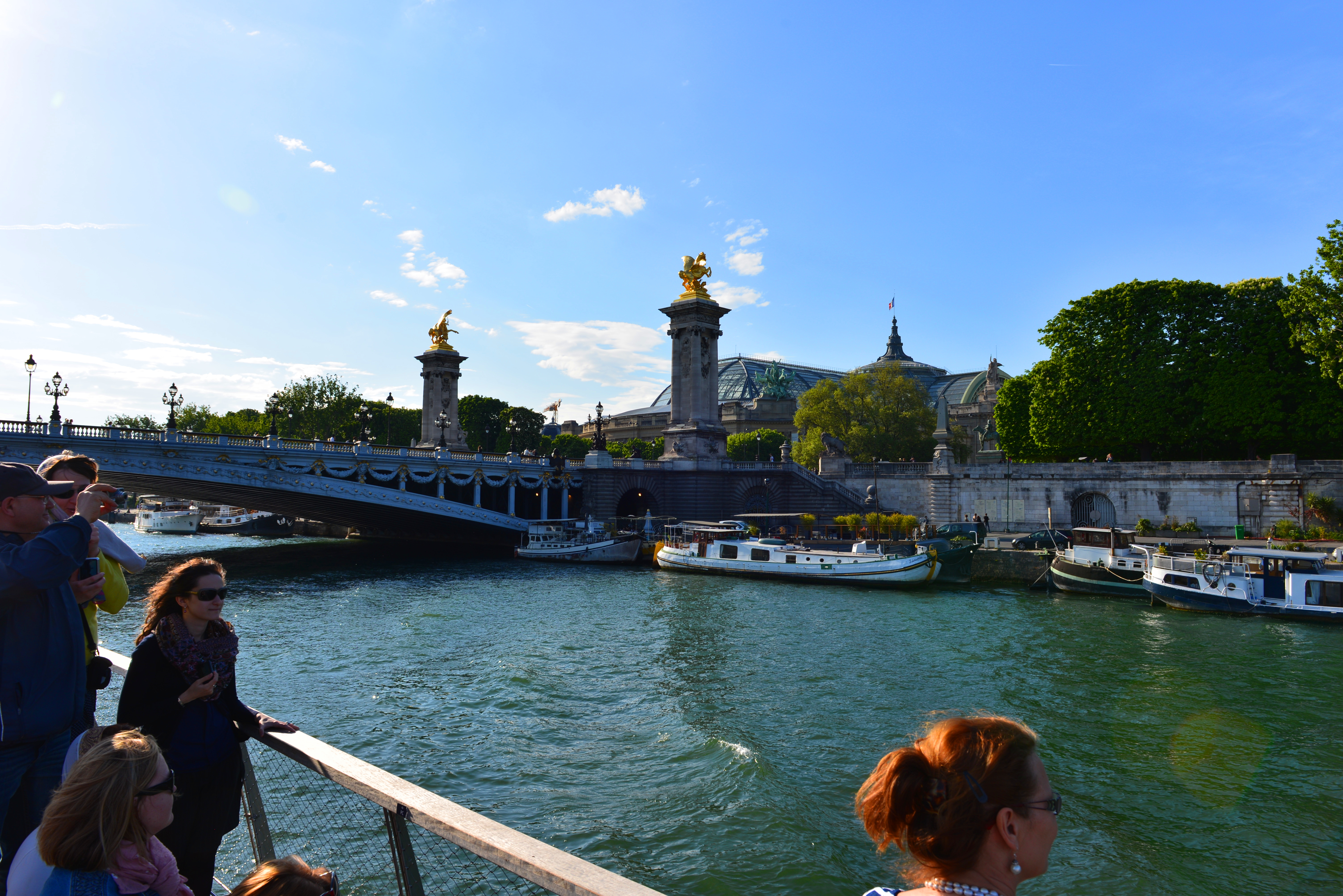 离开凡尔赛宫后,我们乘RER C线到埃菲尔铁塔站(Gare du Chamo de Mars Tour Eiffel )下车,然后步行到游轮码头坐船游塞纳河。塞纳河有许多游船码头,大多数码头都集中在埃菲尔铁塔附近,不带餐食的游船大致可分为中途不停的(15欧)和可以随上随下的(20欧)两种类型,我们选坐的是中途不停靠的,往返1个小时10分钟左右的时间。