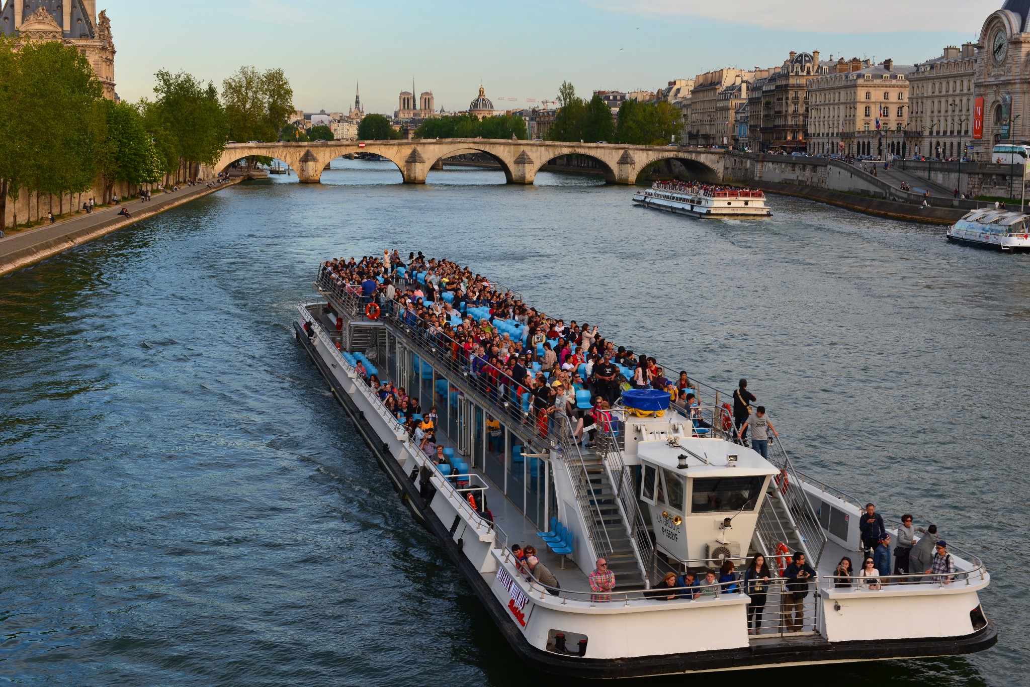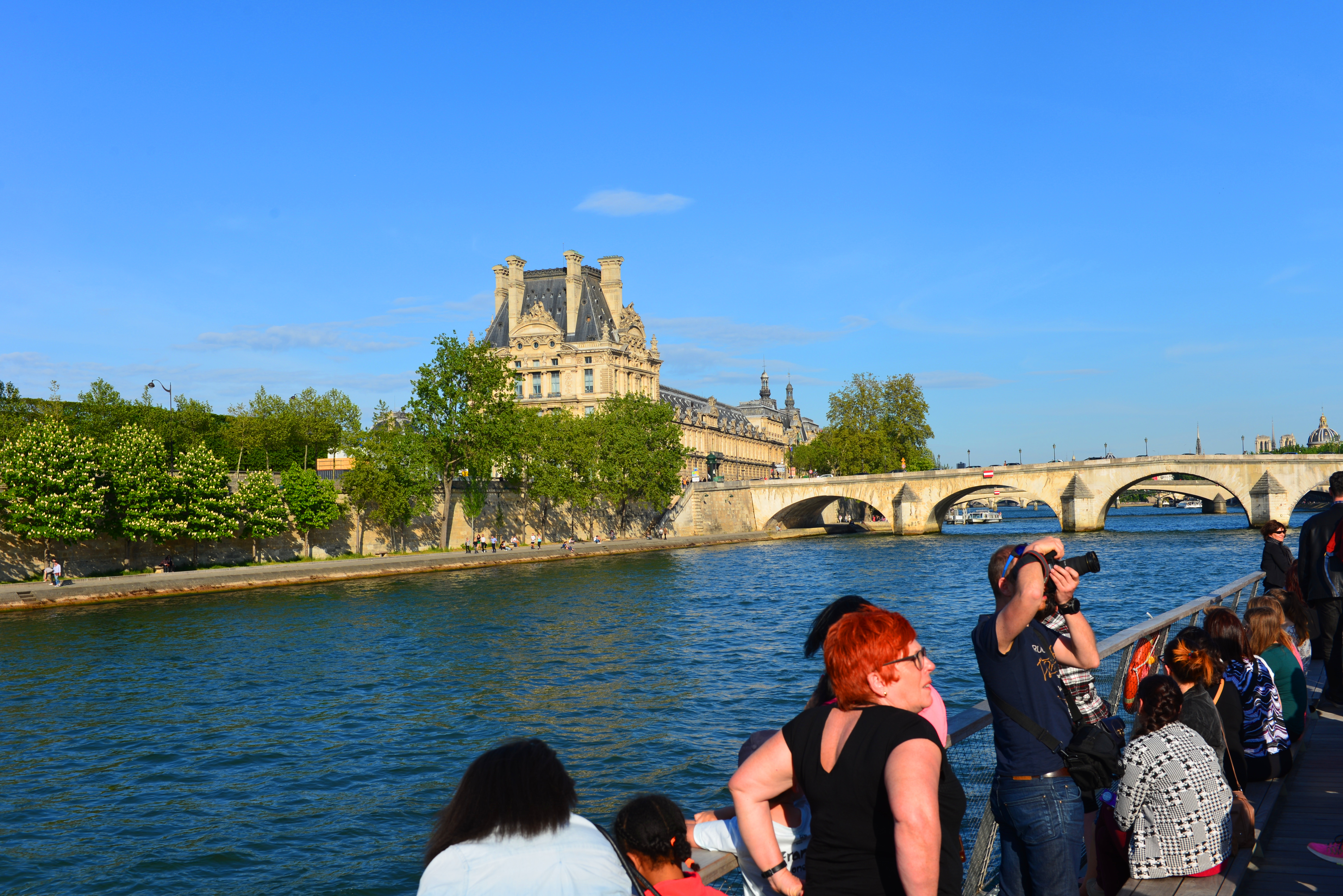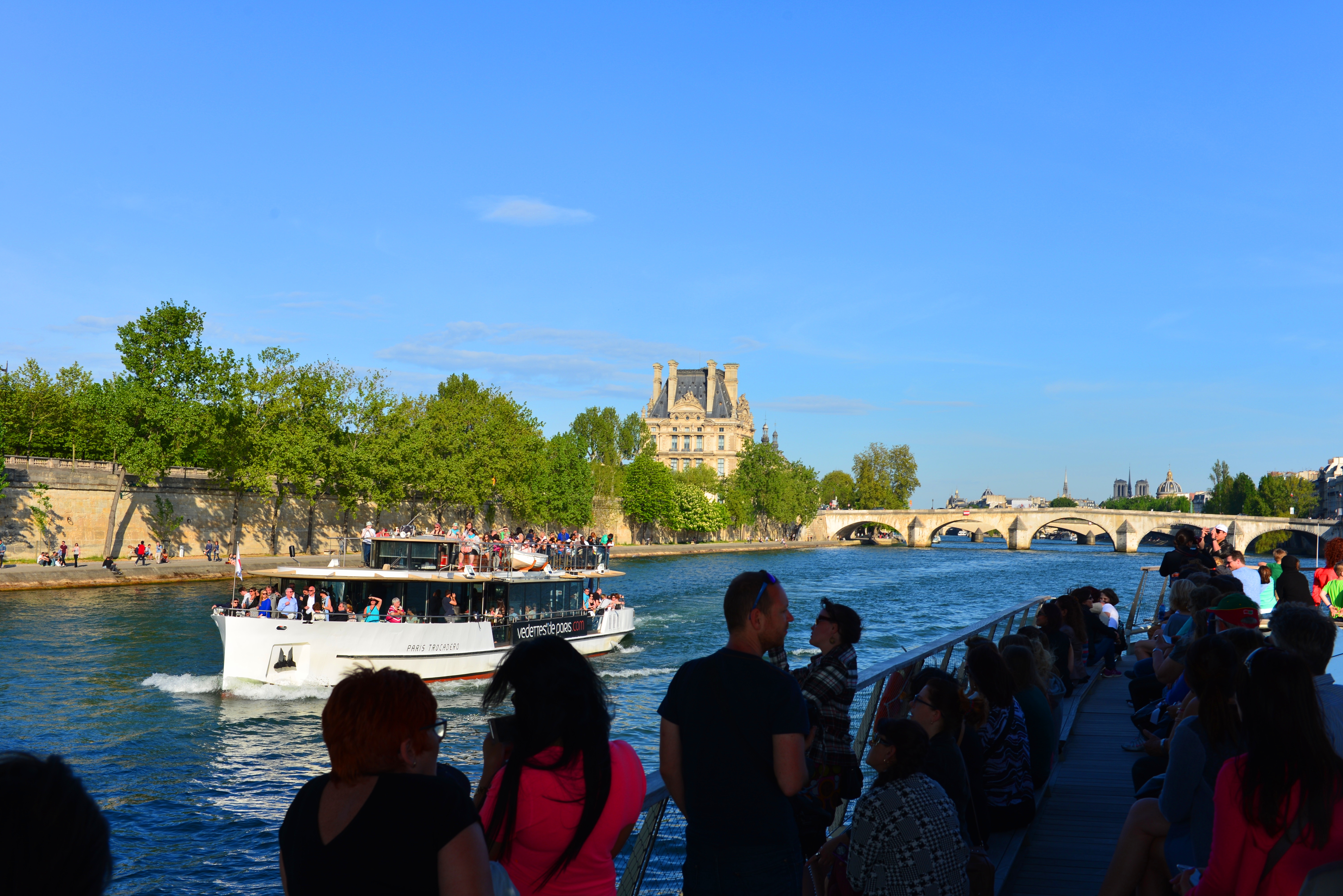 巴黎的主要景观都在塞纳河两边,所以塞纳河游船是最好地欣赏巴黎美景的方法。从塞纳河上看巴黎,所得到的印象与任何时候都不同。游船每到一个景点就会用英、法、中、韩等六国语言不停进行解说,巴黎圣母院、埃菲尔铁塔、卢浮宫等等都可一览无遗,岸边的巴黎人在那晒着太阳,悠闲地喝着红酒,还会时不时地和你挥手。