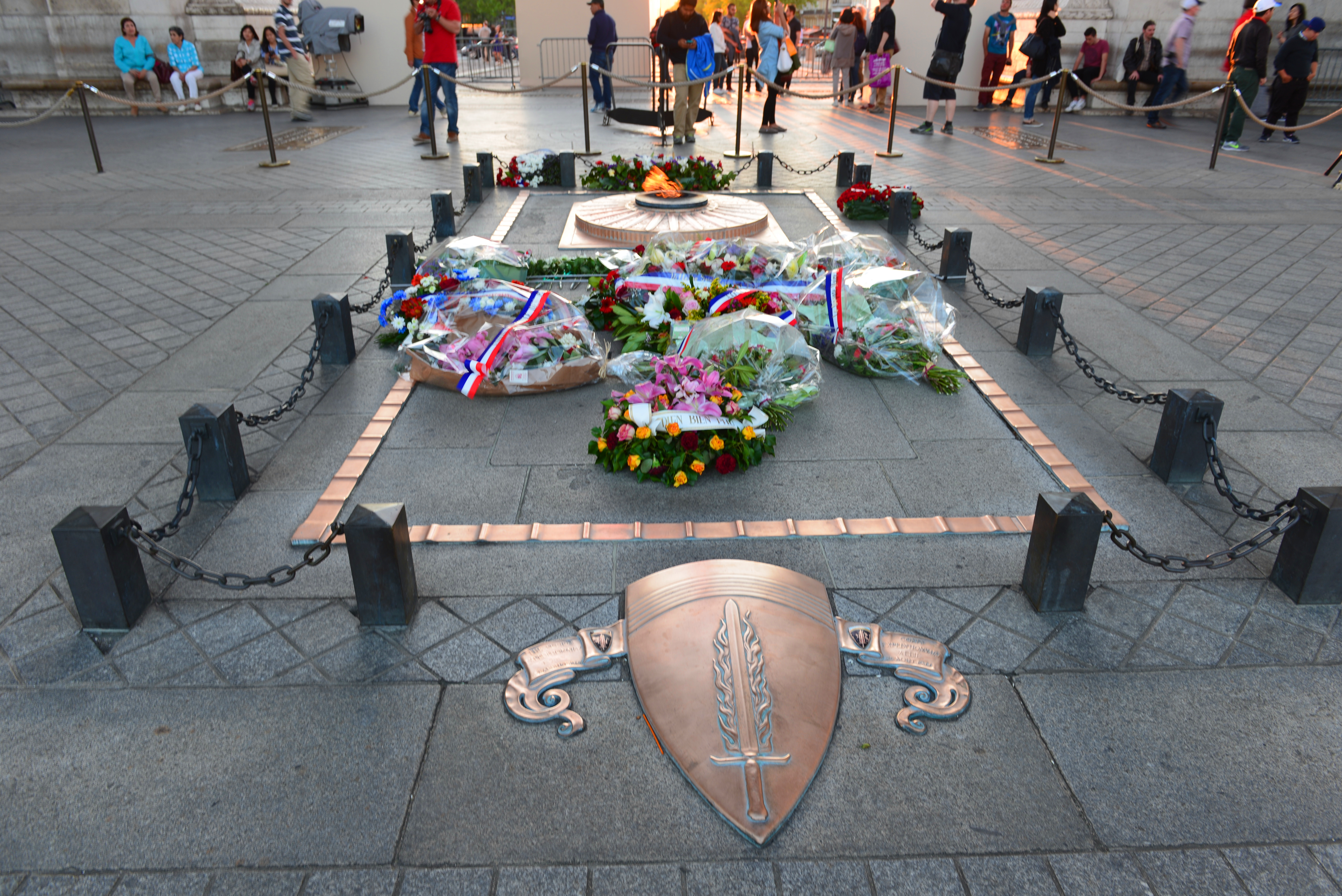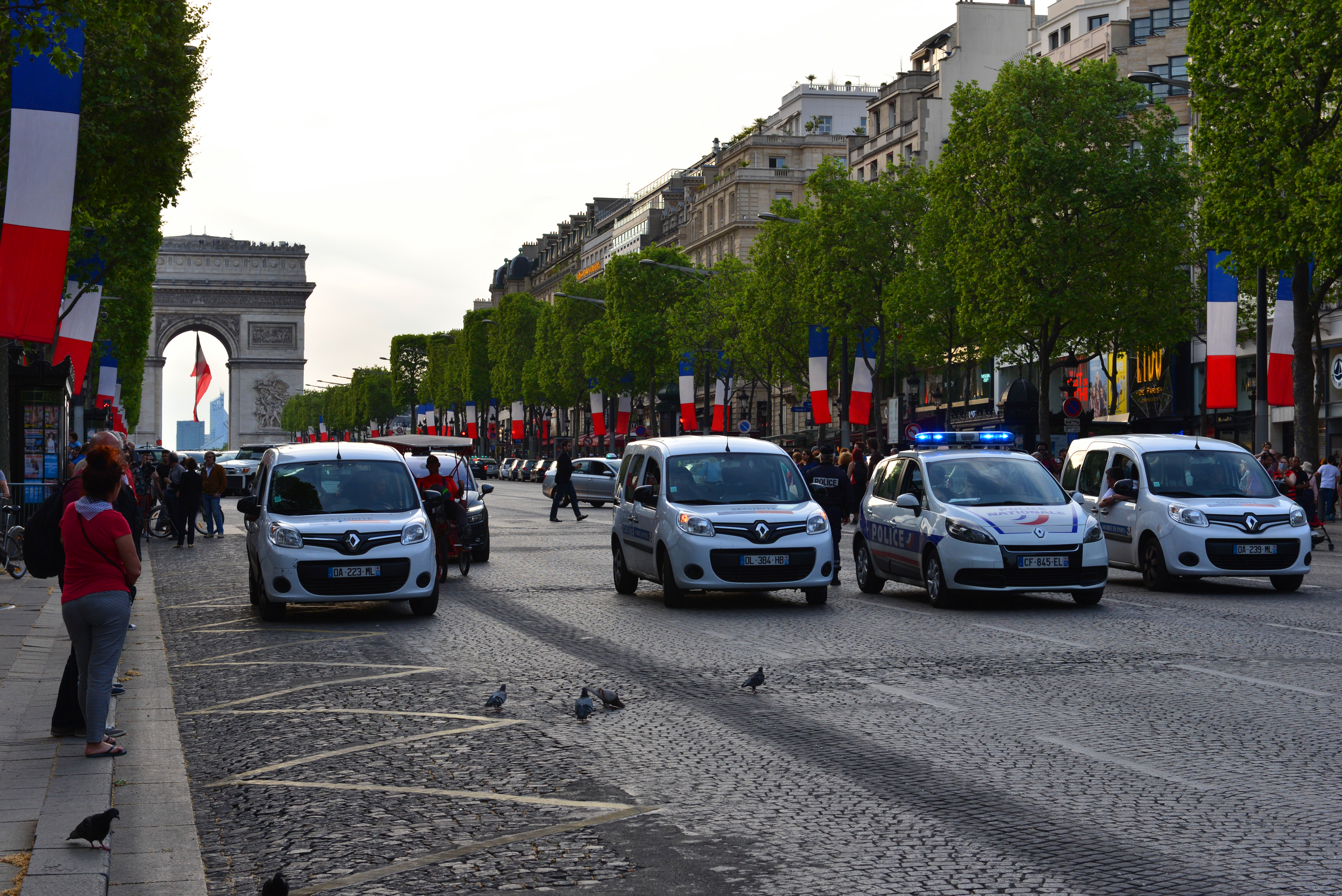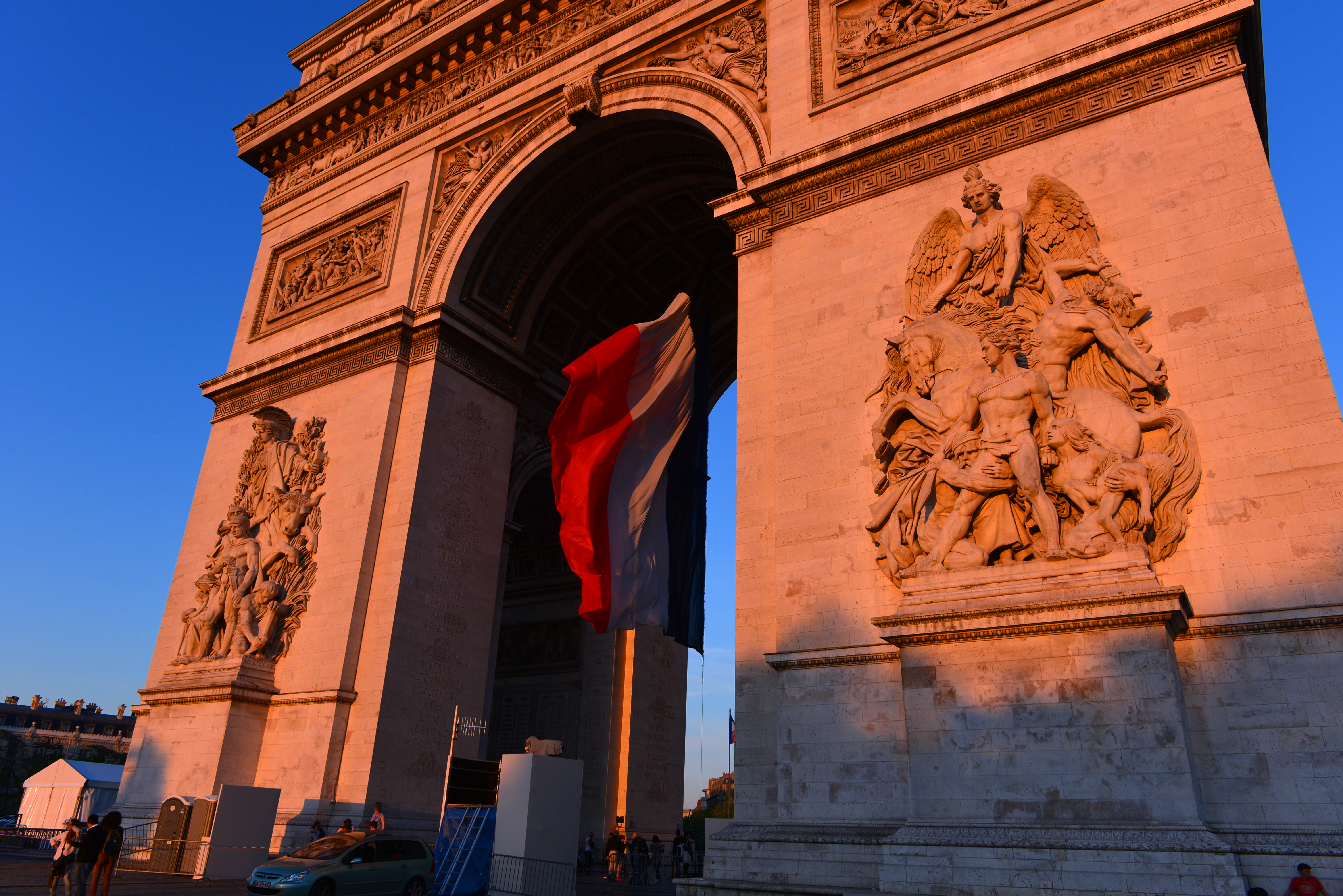 因第二天(5月8日)是法国二战结束纪念日,法国将要在凯旋门搞纪念活动,总统奥朗德届时也会到场参加纪念活动。所以,法国警察对凯旋门进行了部分封锁,进行装饰,但基本上不影响游客参观凯旋门,这种做法确实比国内人性化多了。