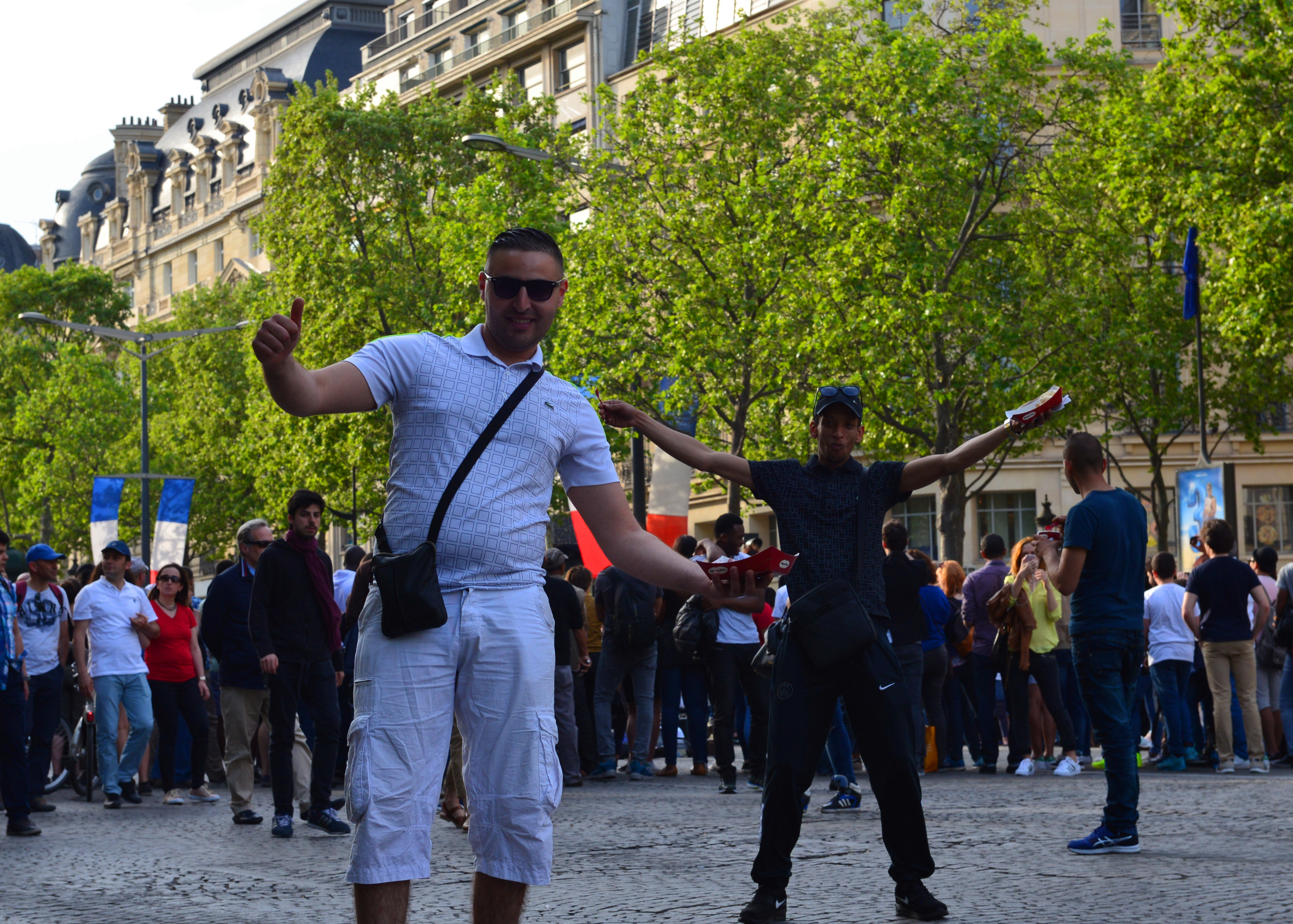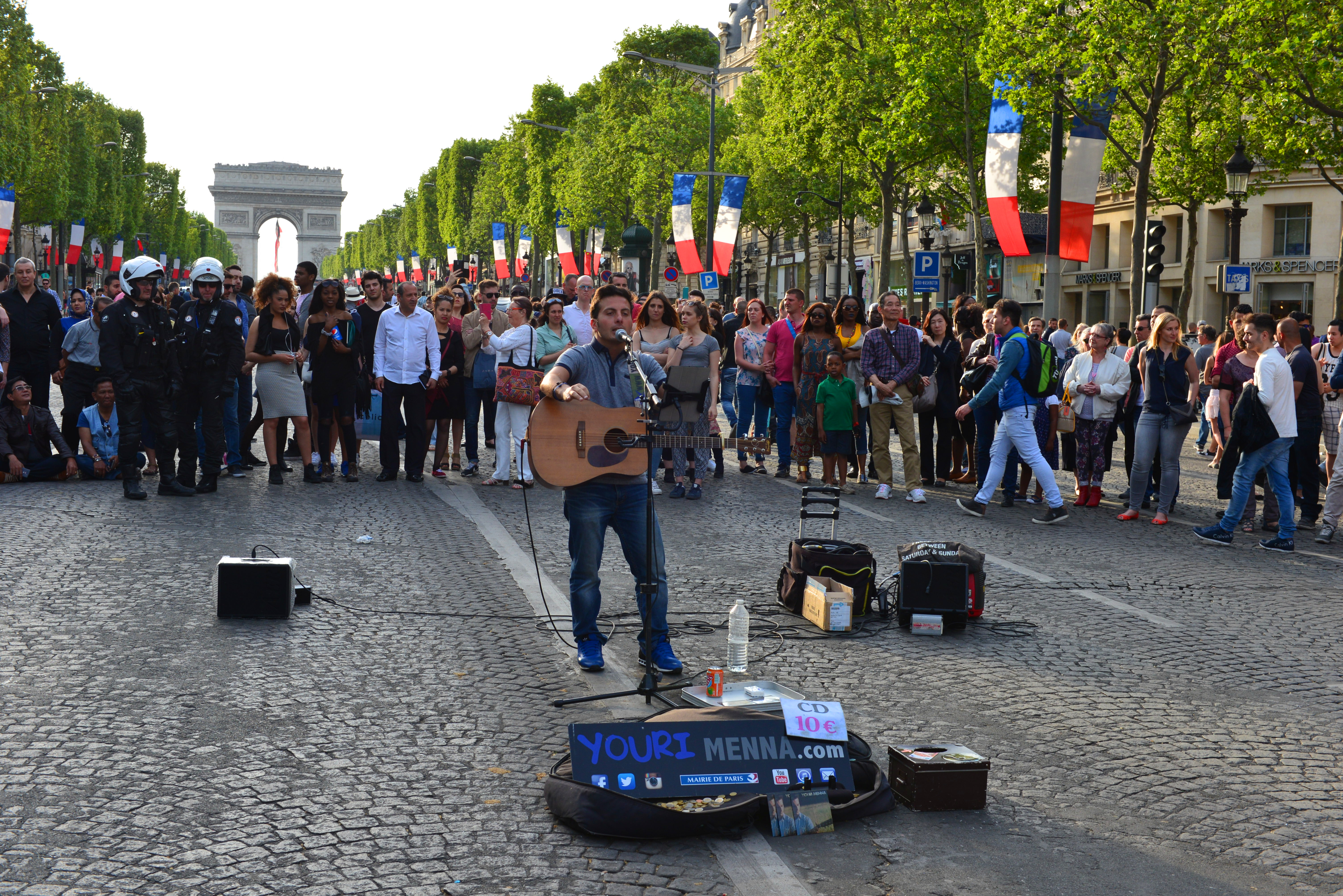 我们一路走到凯旋门附近后,夫人和女儿要逛香街和蒙田大街上的商店,我对购物不感兴趣,看到街头有艺人在表演,就跑过去围观拍照。过了1个多小时,她俩还没回来,我就一个人坐在马路沿上休息。