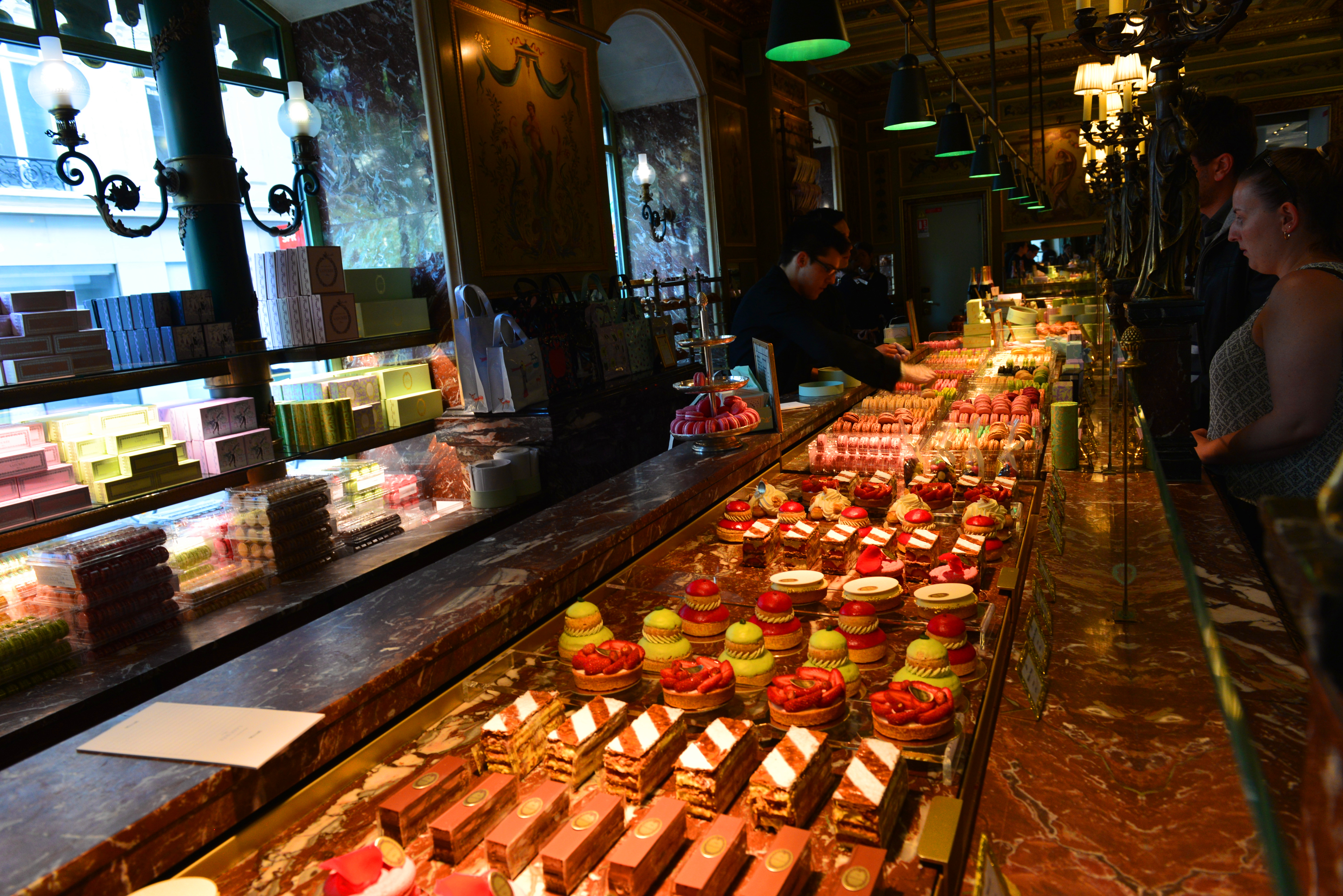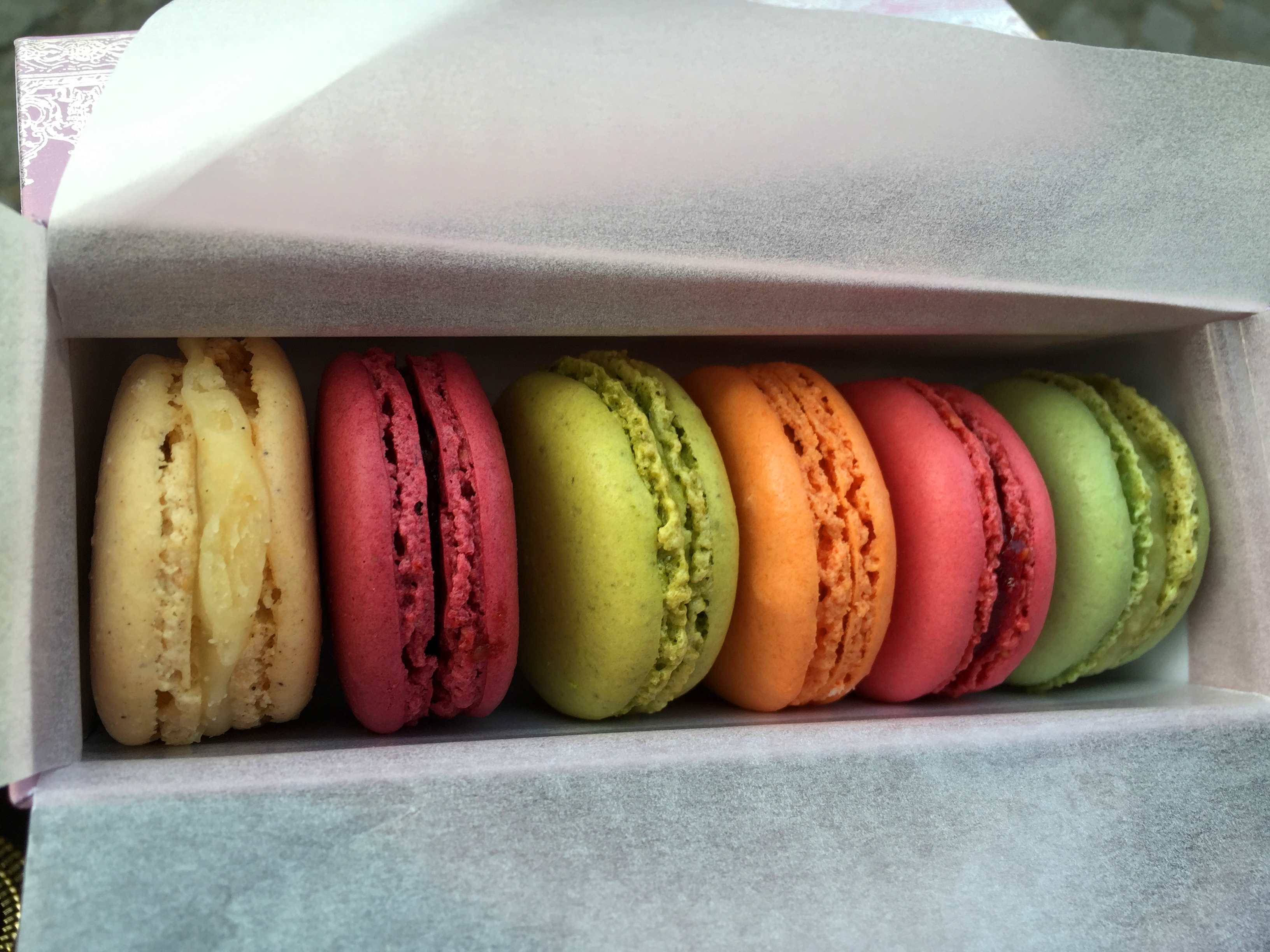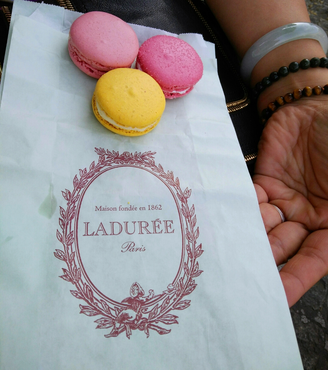 又过了一会,夫人和女儿回来了,还带着马卡龙和咖啡给我,我知道香街有个卖马卡龙的店很著名,但具体位置在哪没查过。我问她们在哪里买的,她们说就在我身后不远处,我顺着她们指的方向仔细看了店名,才发现确实是这家著名的店。