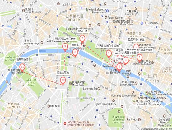 安顿好行李后,我们先是去了酒店附近的圣厄斯塔什教堂,接着步行前往卢浮宫、波旁宫、亚历山大三世桥、荣军院,最后是埃菲尔铁塔。我们的步行路线见下图。