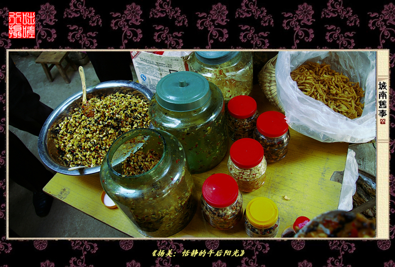 途经一家卖扬美特产的小院,摆卖着泡椒、萝卜干、木瓜丁等,令人垂涎。虽说是难登大雅之堂,但纯正的味道却是在市区菜市场里难以觅寻的。