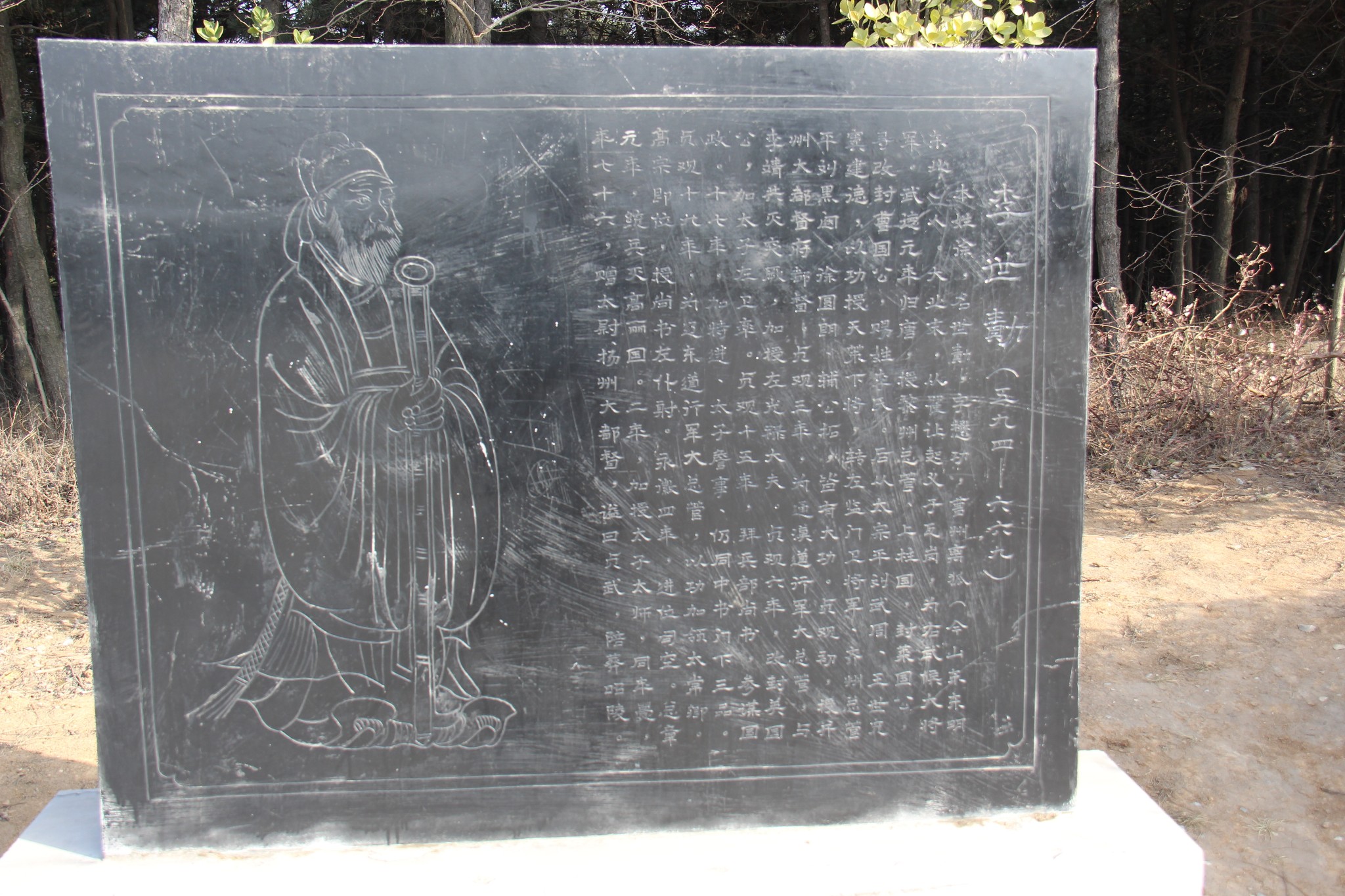 在李世民昭陵的神道两旁有凌烟阁二十四功臣画像记简介石刻。这是唐俭。