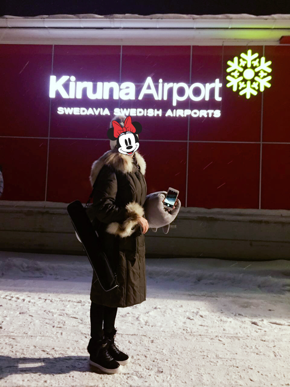 坐了9个多小时,下了飞机还是有点迷糊时差没倒过来,阿兰达机场内陆转机T5到T4走的不是很长,候机楼都是连着的,等了五个小时坐上去基律纳的航班,基律纳机场小的很,进了门就能取行李,机场大巴110sek一个人,现金刷卡都行,我们下了大巴拖着沉重行李,苦逼的走了十几分钟才到酒店,路边都是雪,只能在行车道走,幸亏大夜里没什么车,雪厚的一开始都没找到酒店正门。