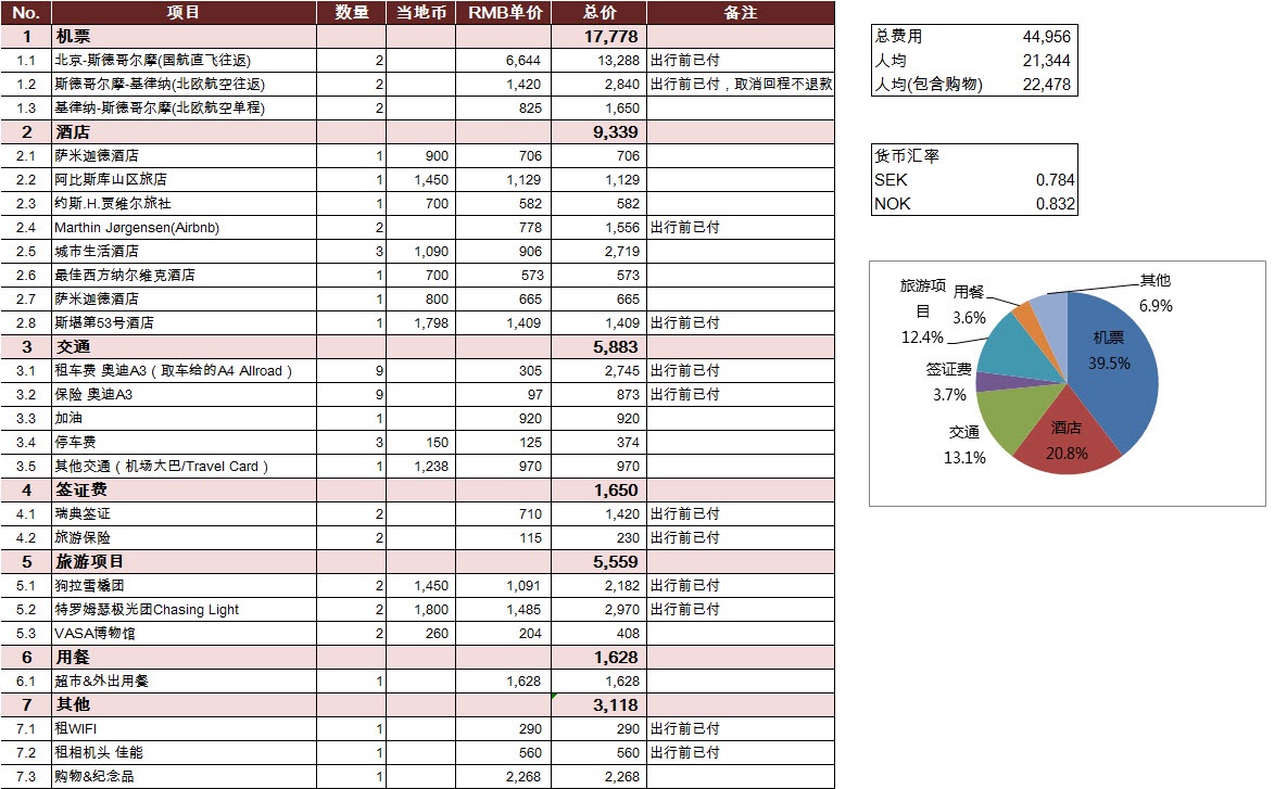 出行前人均预算23000,因为基律纳-斯德哥尔摩一程的机票废了,也没退钱,所以机票占得比例比较高,然后有些景点没去(冰旅馆内部、阿比斯库天空站、特罗姆瑟缆车),所以最终花费都在预算内。