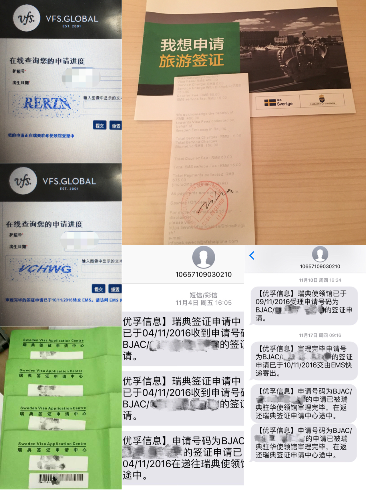 • 11月9日周三,VFS网站查询进度为申请在瑞典驻华大使馆受理中(短信10号才收到)