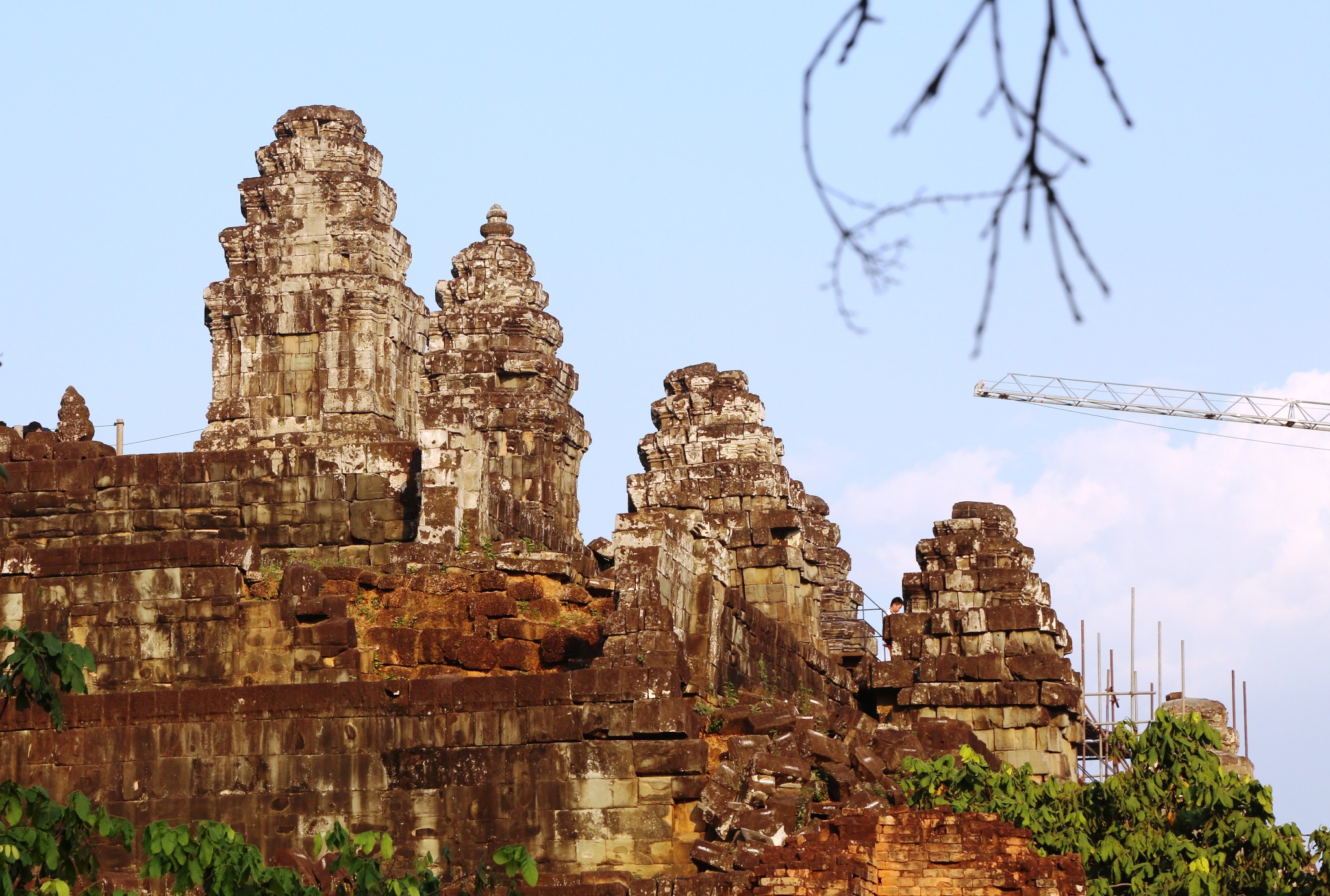 巴肯山是吴哥主要遗迹群内的一座小山丘,在吴哥窟西北1.5公里处,高67米,是附近唯一的制高点,可以骑大象上山。山丘上有一座吴哥庙宇遗迹,是耶输跋摩一世开始以大吴哥城附近地区为首都后的第一座国庙,亦奠下后来吴哥建筑的基础格局。山顶上的巴肯寺虽然早已破败,但是它是高棉王朝移都吴哥建造的第一个寺庙,被称为“第一次吴哥”。第4天旁晚,我们安排观赏巴肯山日落,已经下午四点,我们急匆匆爬上去,山不是很高,上路也比较平坦,大概半个小时就可以爬上去。