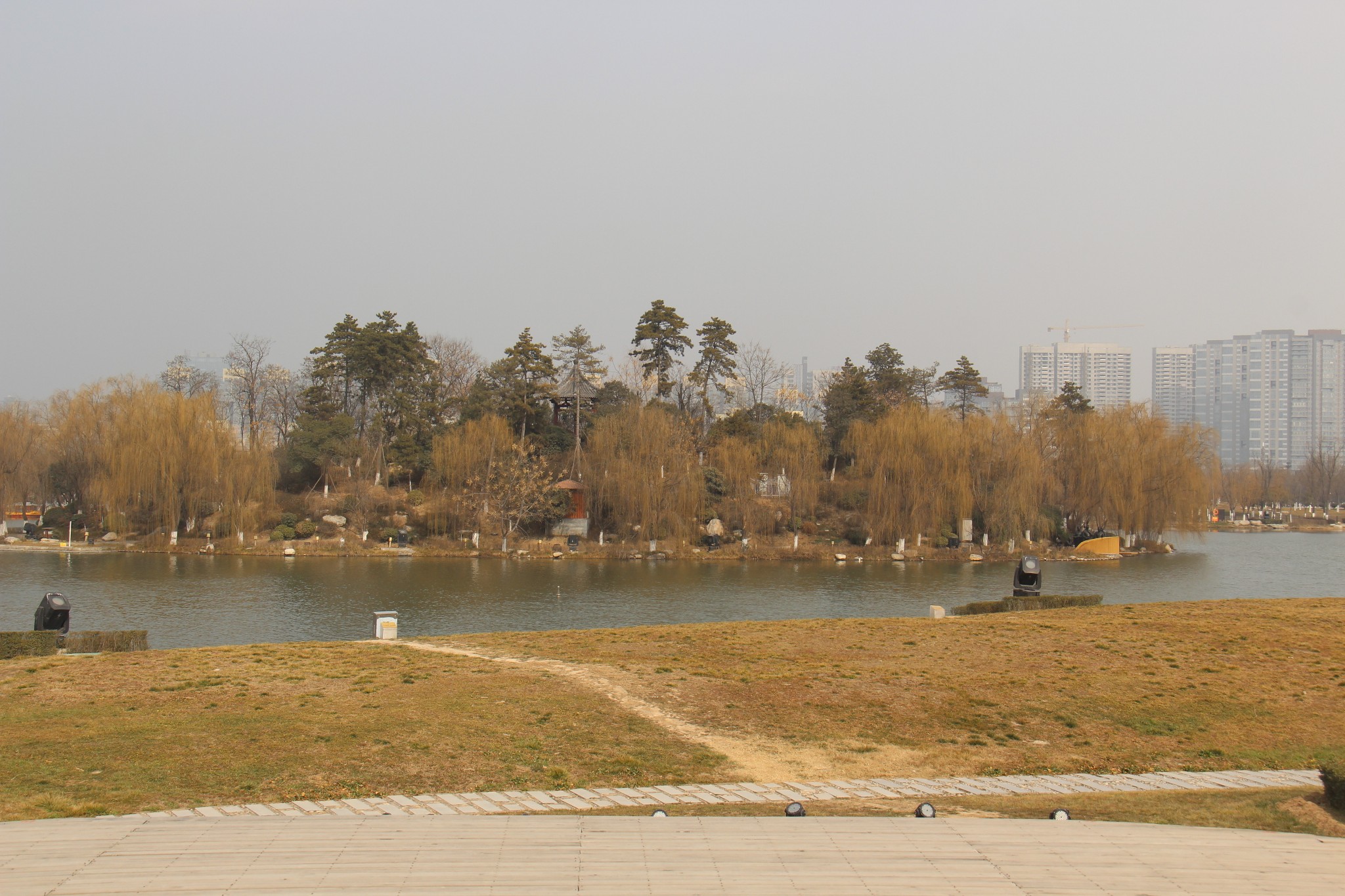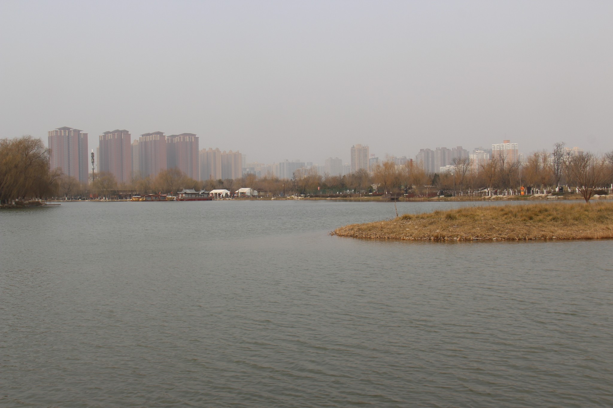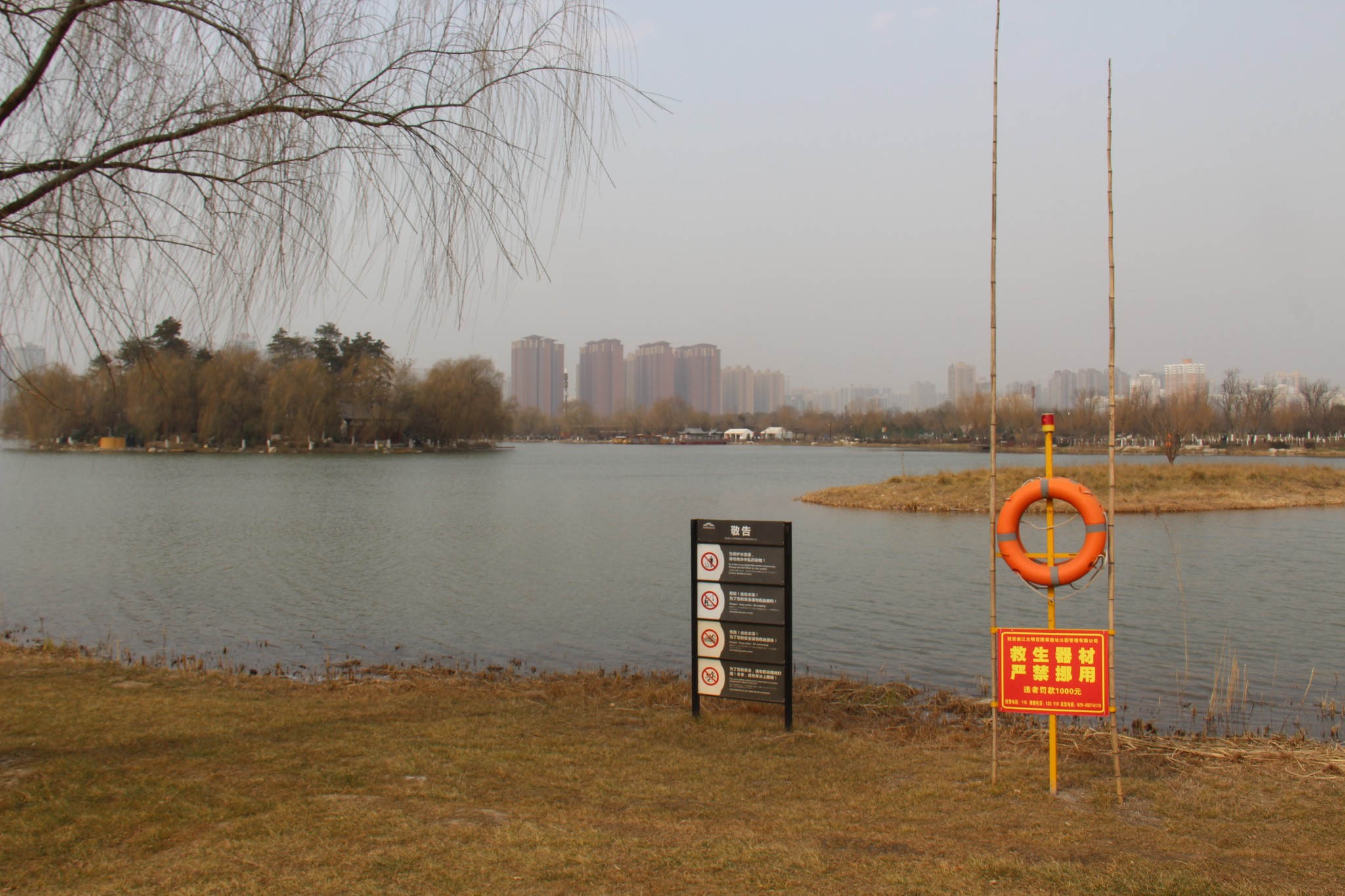 1月30日早上,结束咸阳的游览,坐着咸阳严师傅开的网约车,来到西安市。参观的第一站是到大明宫路上的汉城湖公园。这个公园免费开放,建在西汉长安城的长乐宫遗址上,原先我还抱有一点期望,但是进入以后看到沿街的大排档和嘈杂的歌声,觉得环境脏乱差,匆匆拍了几张就离开了。