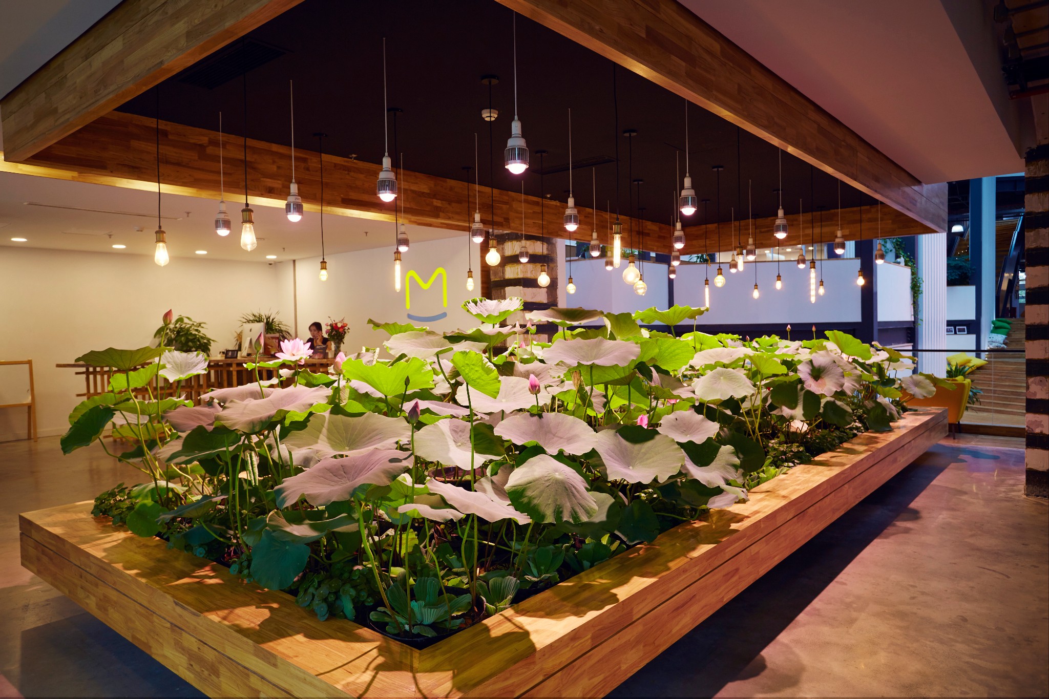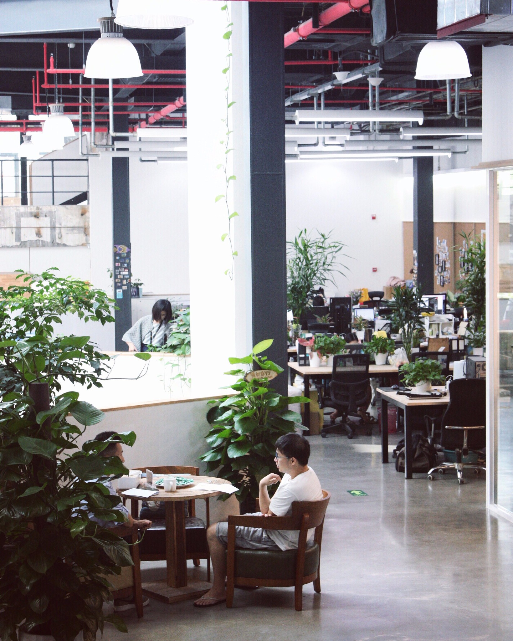 整座总部大楼没有格子间,同事之间沟通方便,气氛简单欢快,隔着转头就可以一起相约出行的距离。木质的办公桌四周,满眼是随处可见的绿植。