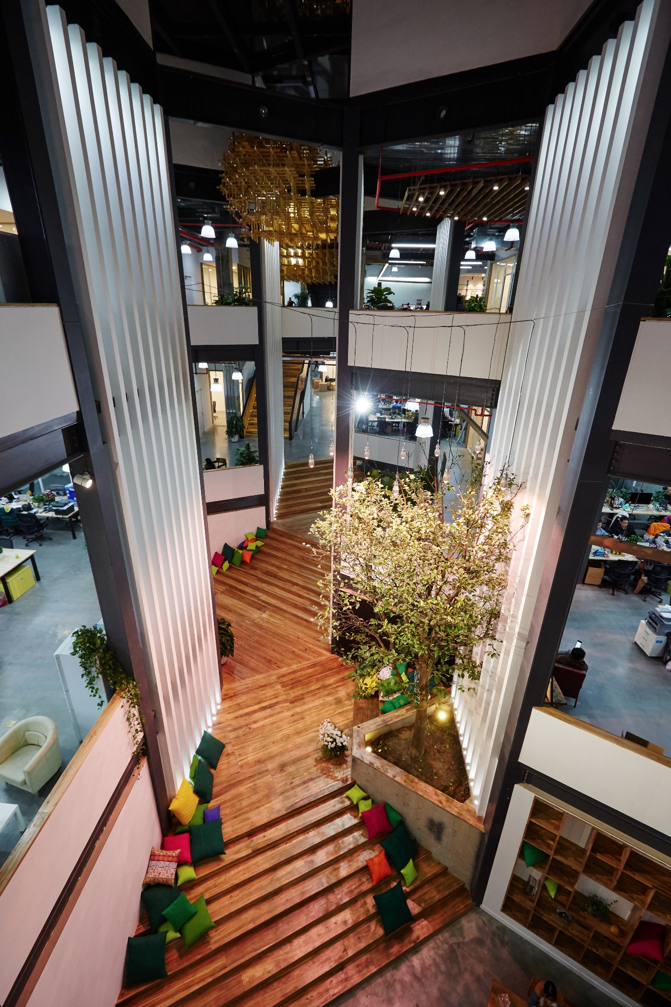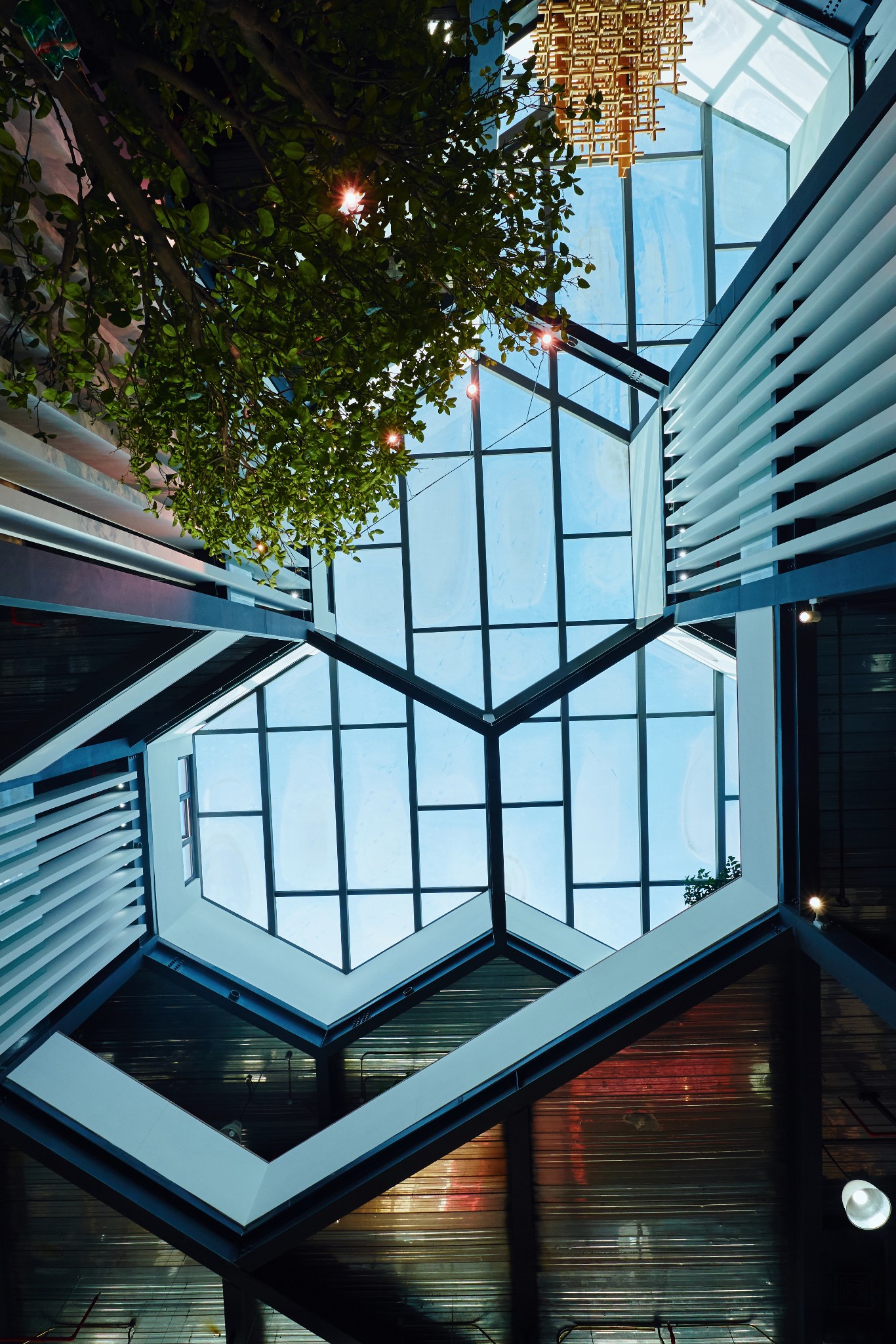 3层空间无隔断,抬头就看到蜂窝形状的玻璃屋顶,工作之余也可以随时仰望天空。