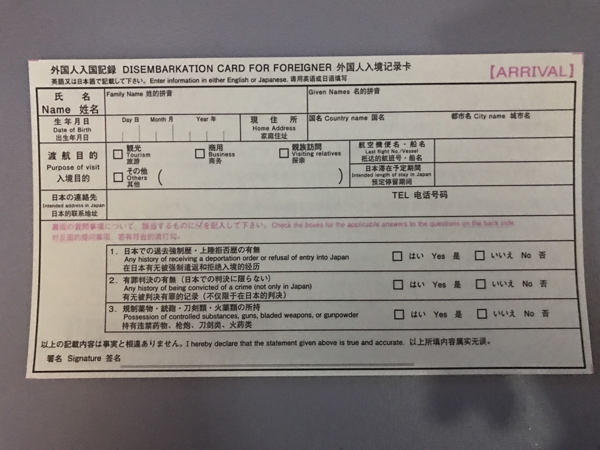 飞行后半程空姐会发「境外人入境登记卡」,每个人都必须填,还有一张「申报单」一个家庭填一张就可以。