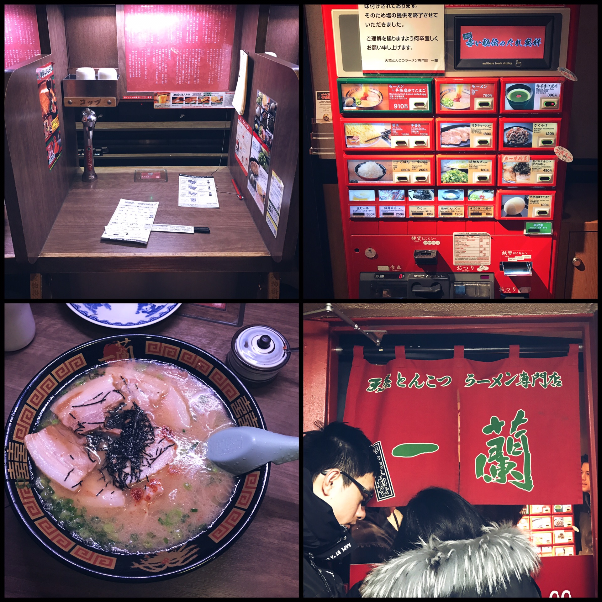 逛累了,回酒店的途中跟着导航找到了一家新桥站附近的「一兰拉面」,一兰一般都在地下,但队伍会排到地上的门口,点餐像自动贩卖机一样投币选择,店很小,只能用一小条来形容,每人一个小格子,面会通过对面的口送进来,然后服务员再把链子拉下来,就像“探监”一样。