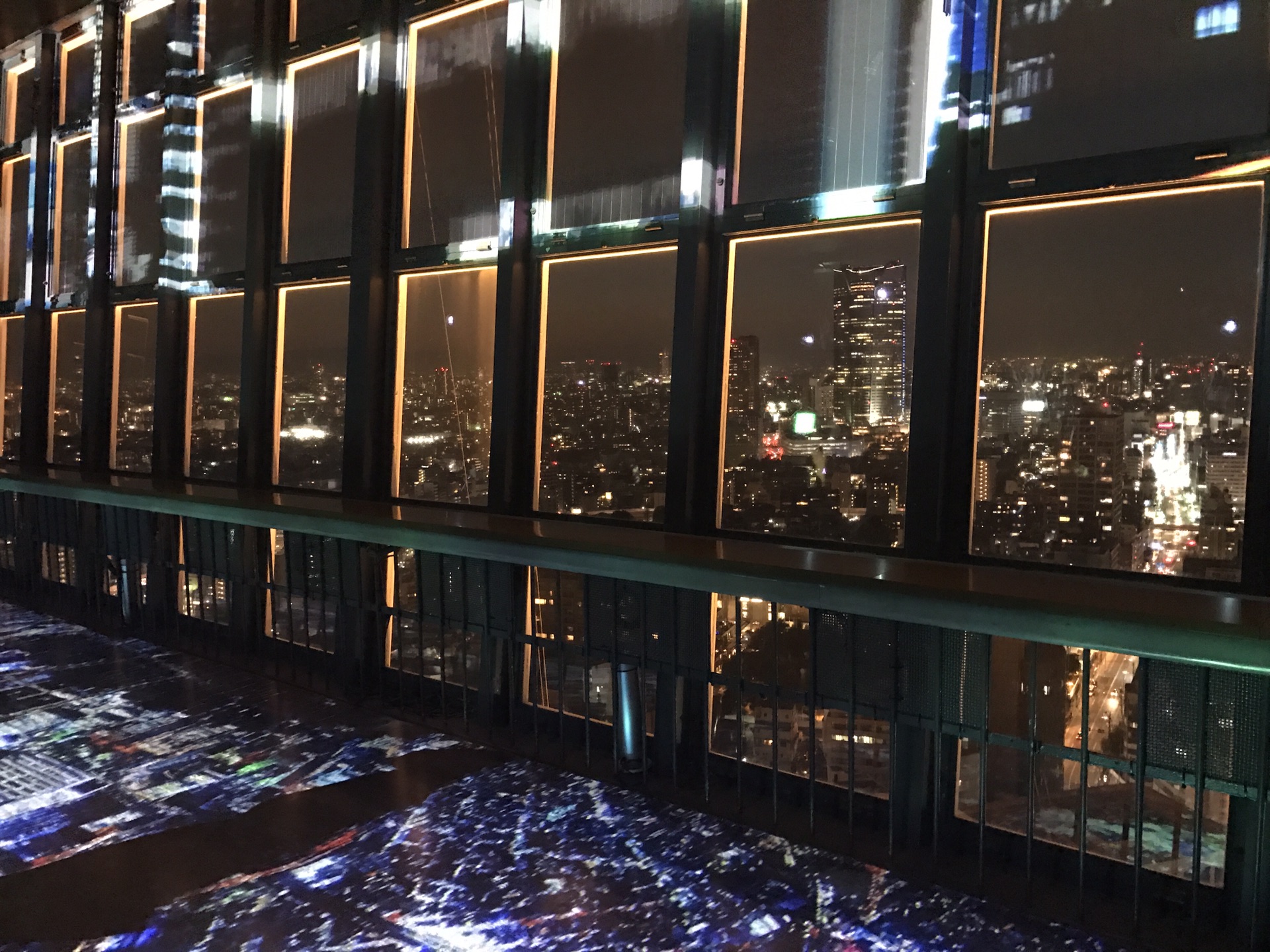 大眺望厅能360度俯瞰东京夜景,晚上6:00开始灯光秀,地上、玻璃上全是灯光效果打出的各种图案,可以用瑰丽来形容。