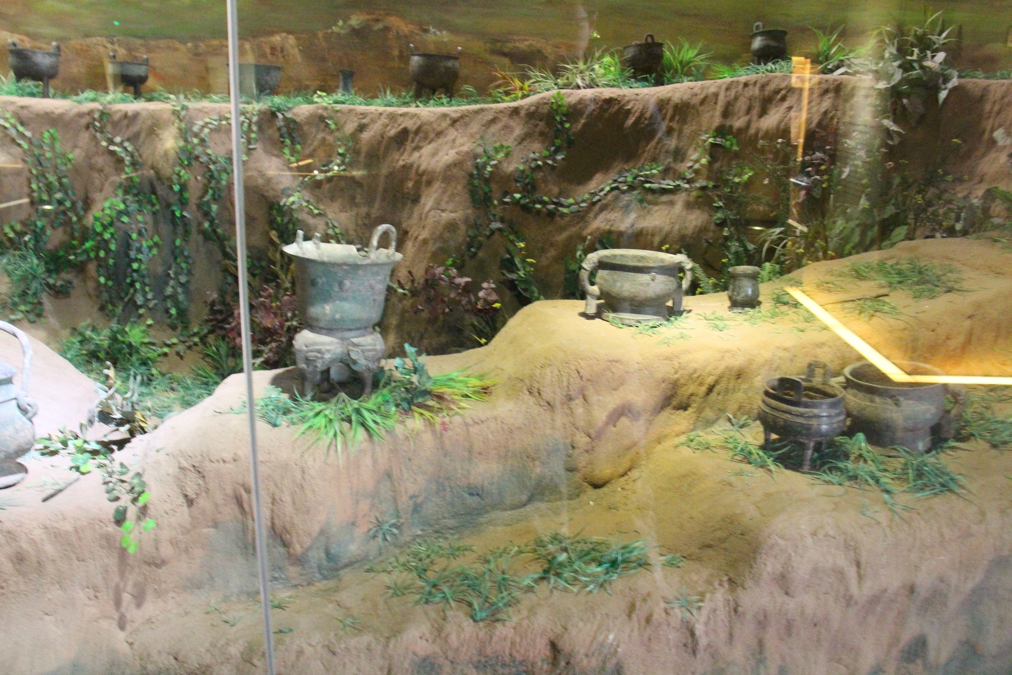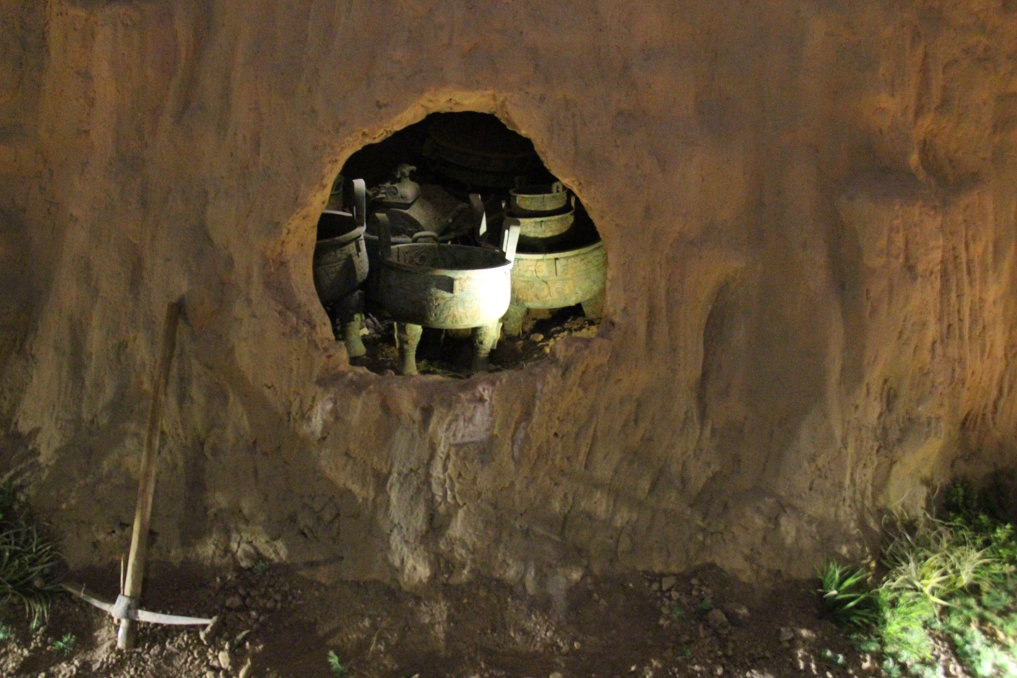 2003年眉县杨家村青铜器窖藏被发现时的场景还原。一共出土27见青铜器,每件都有铭文。器主人为逨。其中逨鼎堪称国宝。