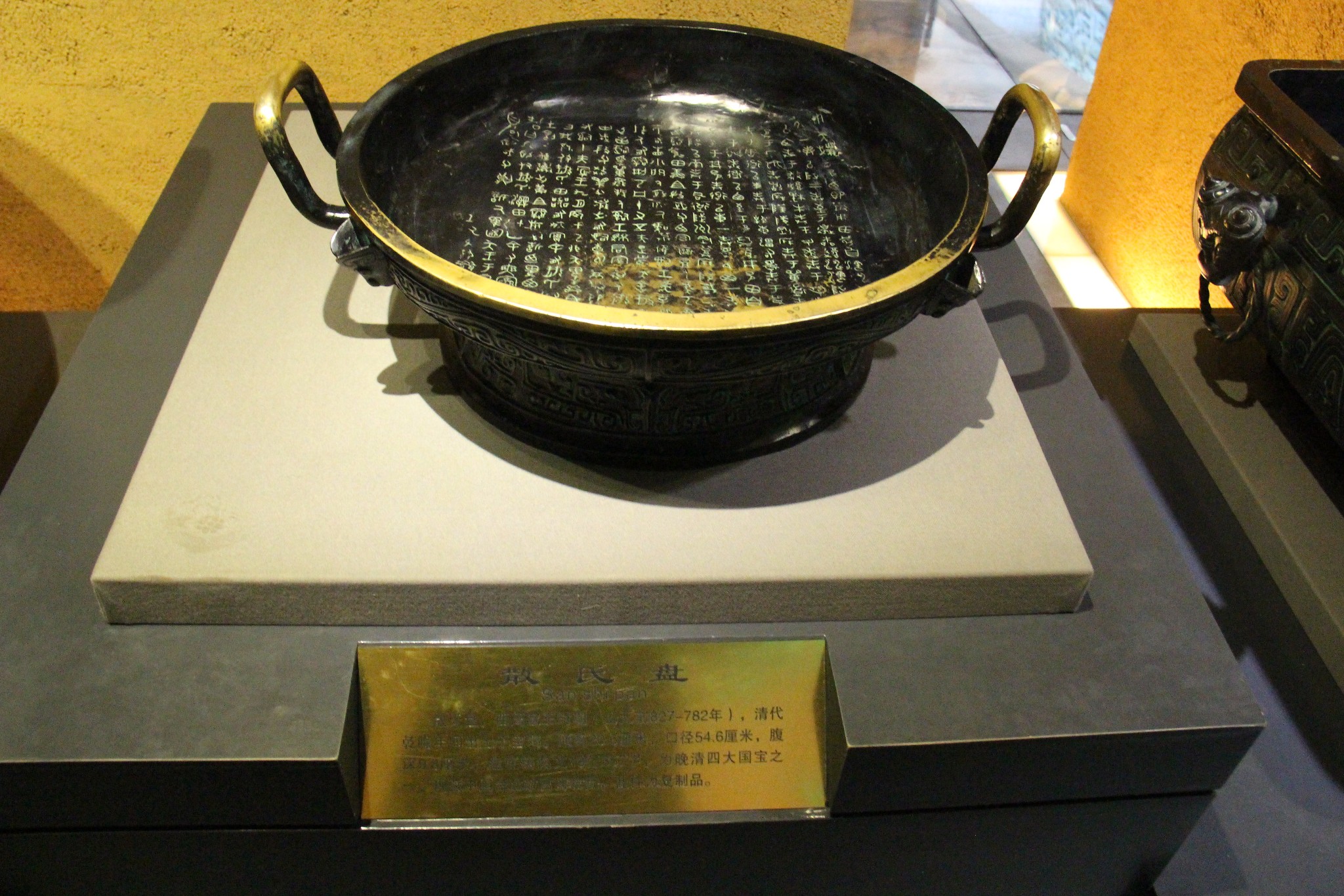 盘高20.6厘米,口径54.6厘米 。圆形 ,浅腹,双附耳,高圈足。腹饰夔纹,圈足饰兽面纹。内底铸有铭文19行、357字。记述地是夨人付给散氏田地之事,是研究西周土地制度的重要史料。