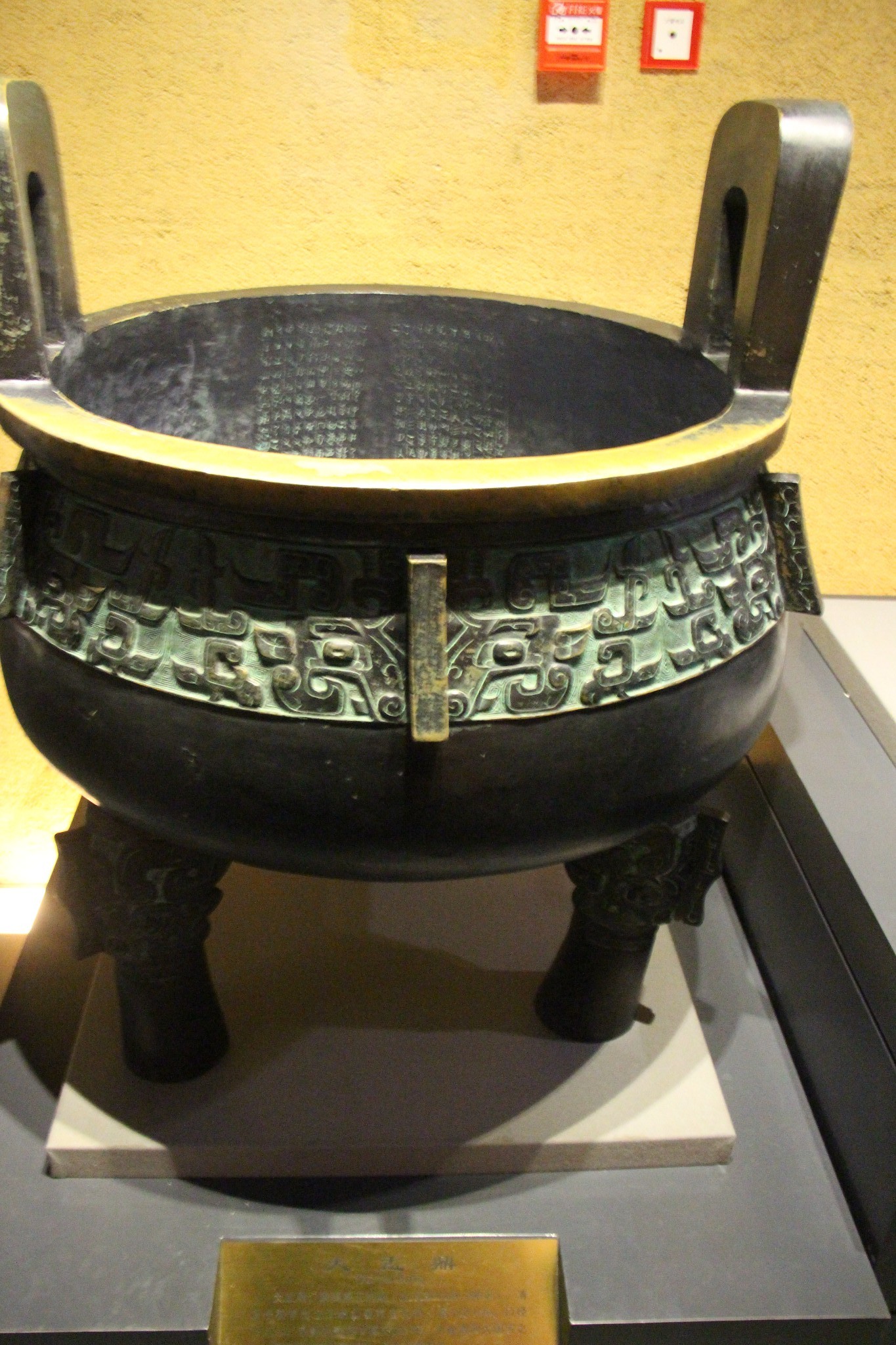 大盂鼎造于西周周康王时期。鼎高一百点八厘米,口径七十八点三厘米,重一百五十三点三公斤,鼎身为立耳、圆腹、三柱足、腹下略鼓,口沿下饰以饕餮纹带,三足上饰以兽面纹,并饰以扉棱,下加两道弦纹,使整个造型显得雄伟凝重,威仪万端,内壁有铭文二百九十一字,内容为周王告盂,殷代因酗酒而亡国,周代忌酒面与,要盂一定要很好地辅助他,敬承文王武王的德政。同时记载给盂的赏赐相传此鼎於清道光间在陕西眉县礼村出土,为该地郭氏所得,后归周雨樵。同治间左宗棠以重金购得,又归苏州潘祖荫。解放后,1951年潘氏后人捐献国家。为上海博物馆所收藏,1959年拨交中国历史博物馆。这件周康王时的大盂鼎,是现存西周青铜器中的大型器。造型端庄稳重,浑厚雄伟,典丽堂皇,为世间瑰宝。西周早期的金文有瑰异凝重、雄奇恣放质朴平宝等数类。大盂鼎属於瑰凝重这一类,铭文大字,字体庄严凝重而美观,故在成、康时代金文中,以书法的成就而言,当以大盂鼎居首位。现藏于:中国历史博物馆。