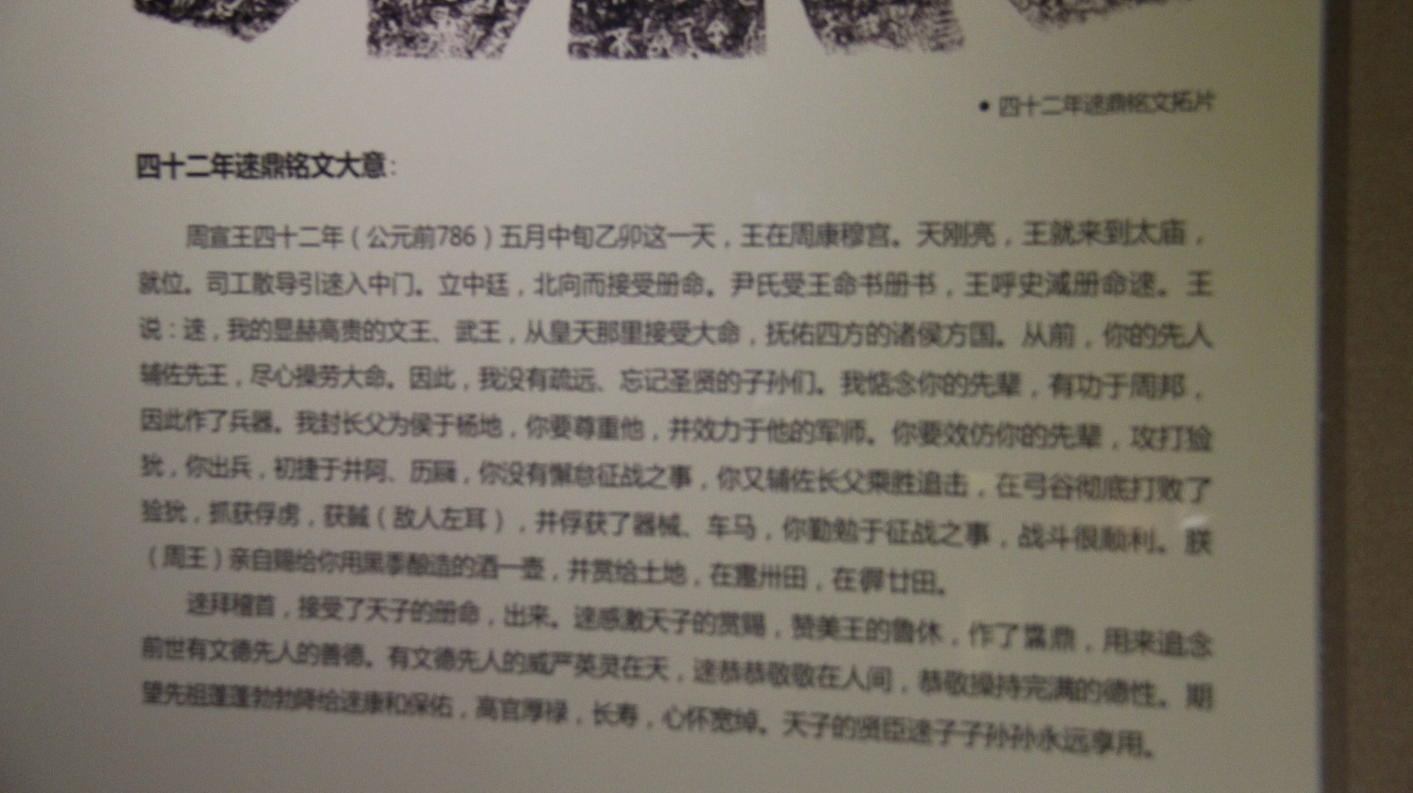 器内铸铭文共25行281字,记述了在周宣王42年(公元前786年),司工散导引逨入中门,立中庭,北向而接受册命。王说:“逨,我的显赫高贵的文王、武王,从皇天那里接受大命,抚佑四方的诸侯方国。从前,你的先人辅佐先王,尽心操劳大命。因此,我没有疏远、忘记圣贤的子孙们。你要效仿你的先辈,助我攻打戎狄,你没有懈怠征战之事,在弓谷彻底打败了戎狄,抓获了俘虏,缴获了器械和车马,你勤勉于征战之事,战斗很顺利,我亲自赏赐给你一壶黑黍酿造的酒和土地。”逨拜首,接受了天子的册命,感激天子的赏赐,作了此鼎,用来追念有文德的先人。铭文详细记述了周王命逨辅佐长父,征伐戎狄有功,受到周王室册封、奖励之事,将逨受到册封的时间、地点、原因及奖励内容记载的十分清楚。