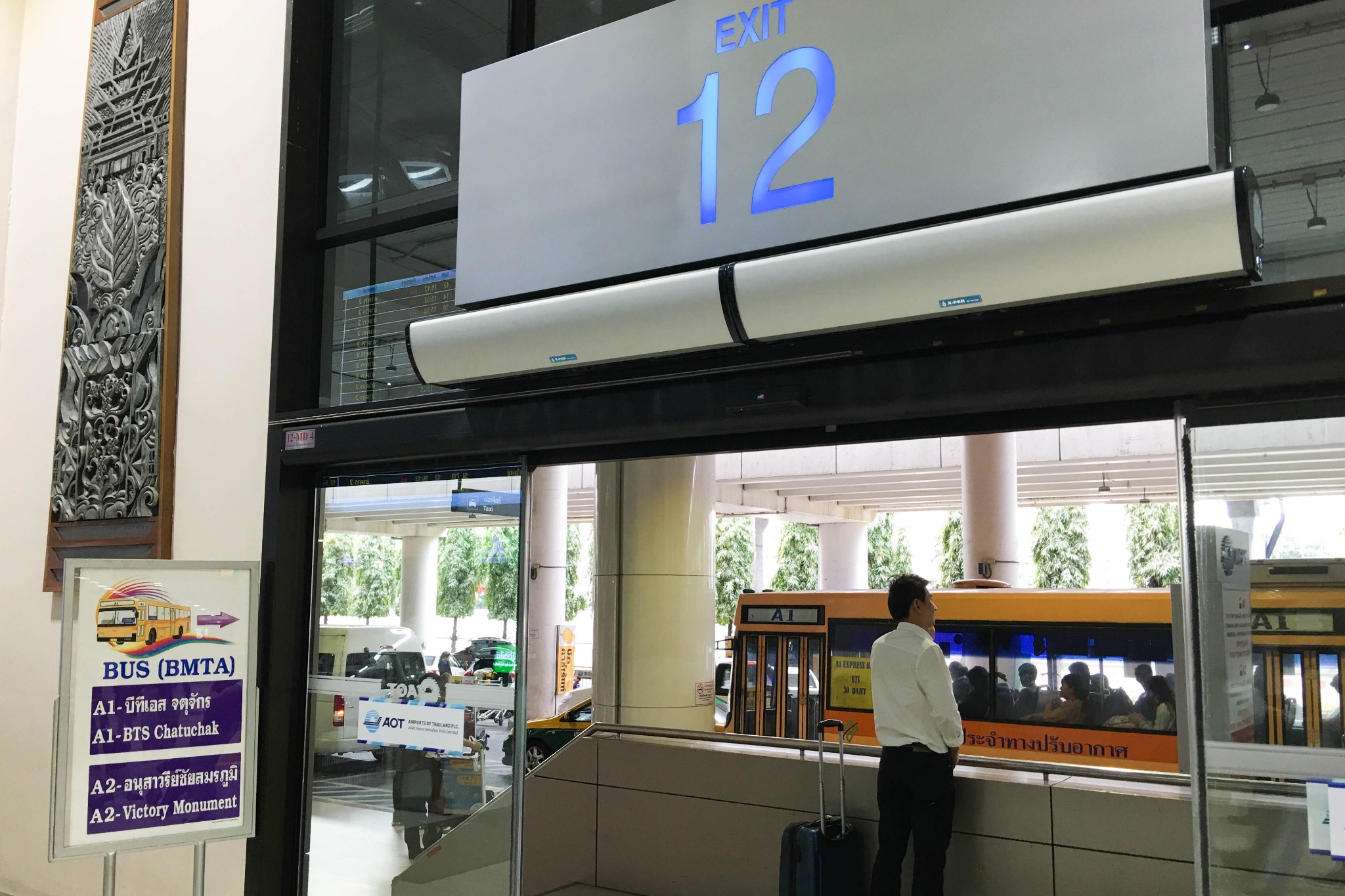 廊曼机场在T2航站楼,12号门口有可以到换乘BTS/MRT的A1,A2大巴。
