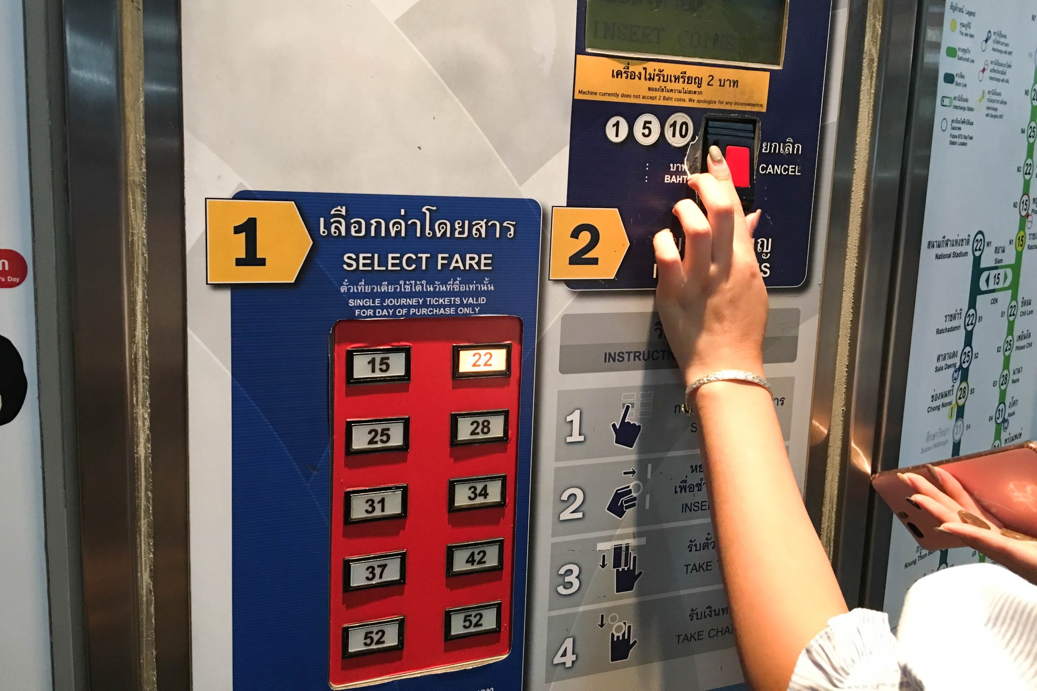 MRT没有零钱的话就去人工窗口直接买票。BTS我们去的时候有一站工作人员给我们换了200B的硬币,让我们自己买。BTS的金额是,看地图上每站的标号,如果这站是42号,那就是42B的意思了。