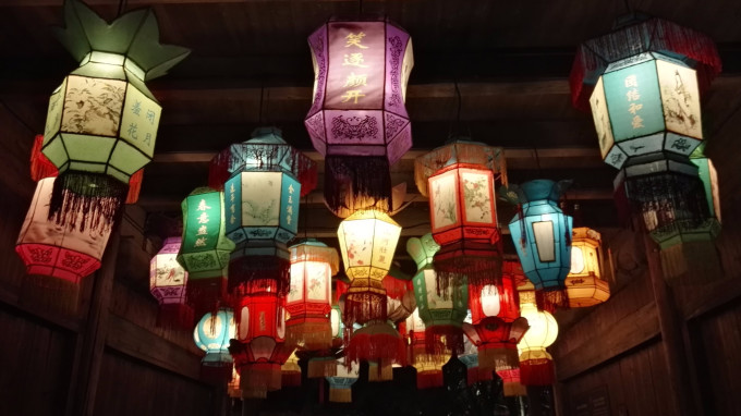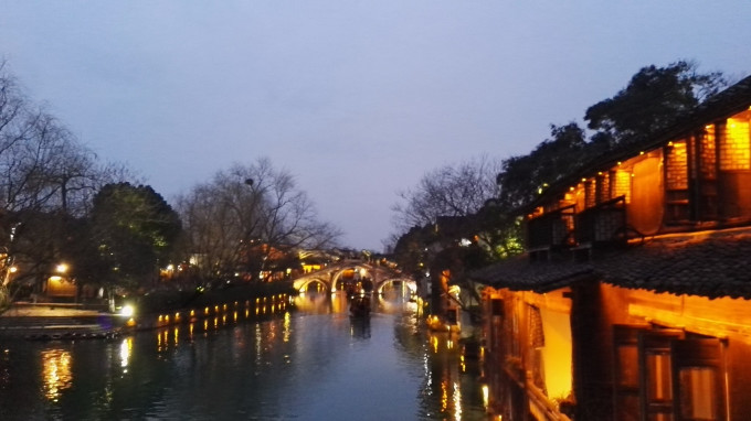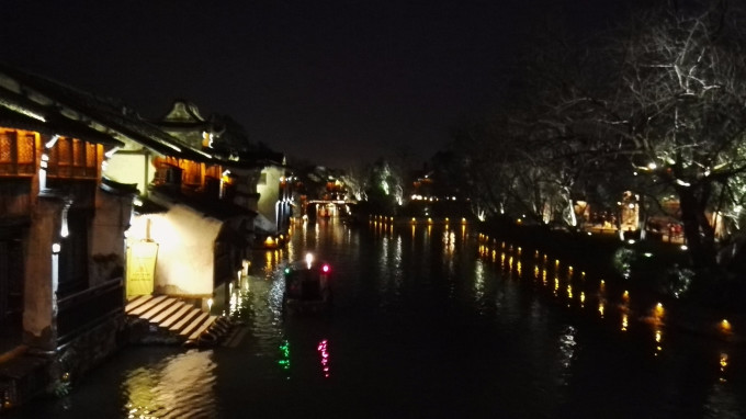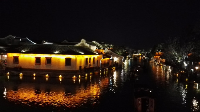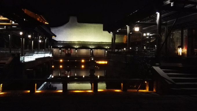 夜晚的西栅灯光极美,灯光照影下的水乡褪去了一丝青涩与庄重,更多一分柔美与灵动。乌镇大剧院夜晚正好在放映影片《乘风破浪》,是在入口处的一块小黑板上看到的通知,奈何时间紧迫,并未前往,有点小遗憾。