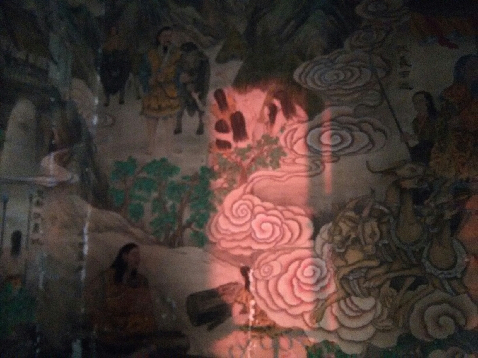 我在看壁画的时候,刚好阳光透过门缝打到壁画上,照亮了壁画上的一群人,壁画这部分大概的意思就是这群人在叩拜伏羲,也许是天意吧,刚好照在这部分,所以我也去拜了拜。