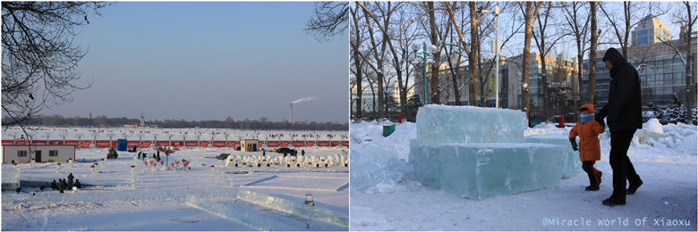 已经结了冰的松花江和正在修建的江边的冰雪欢乐谷,看看从松花江里打上来的冰有多厚,和旁边的小孩子比比。