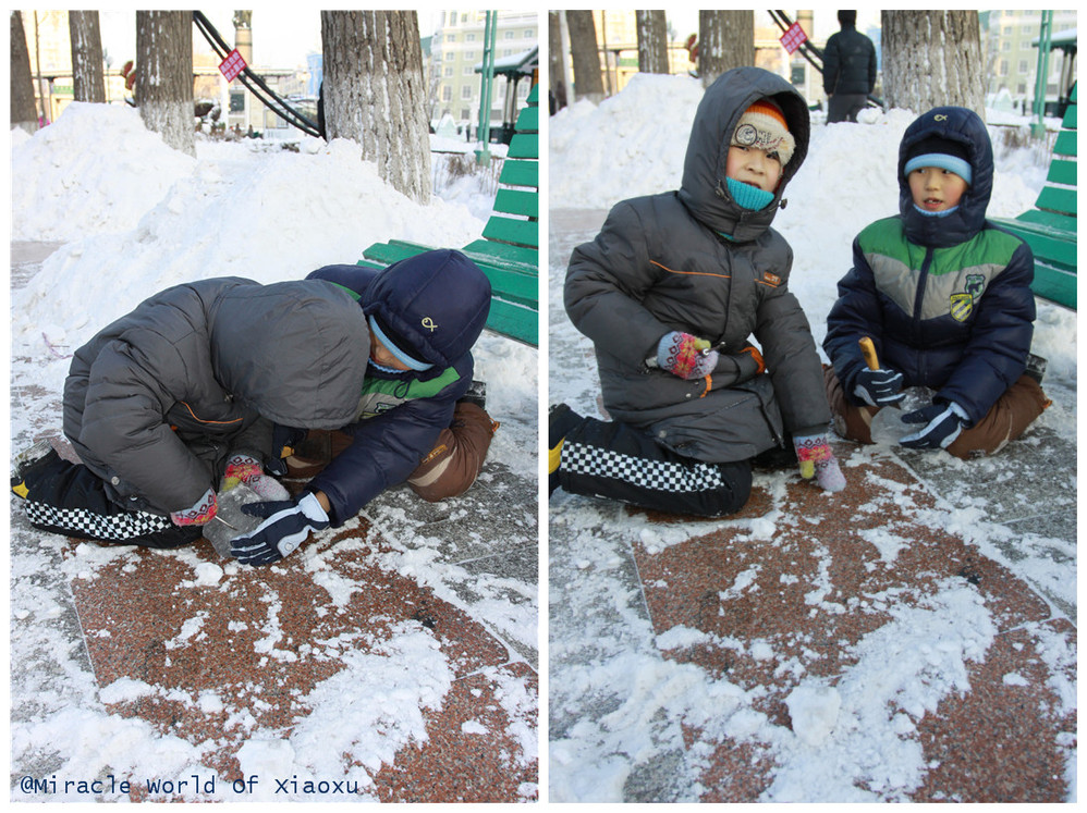 在江边的斯大林 公园,随处可见正在雕冰的哈尔滨 市民,有大人有孩子,这两个孩子的假期作业就是雕冰,真的是冰雕要从娃娃抓起啊。