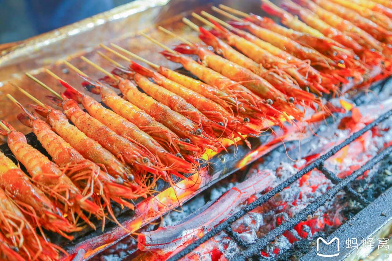 炭火上的烤肉串、烤虾,散发着诱人的味道。