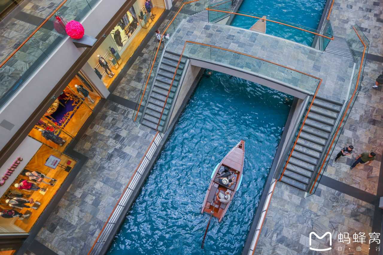 金沙酒店楼下,是一座大商场,商场里有条室内运河,可以坐上手摇船飘荡在运河中。