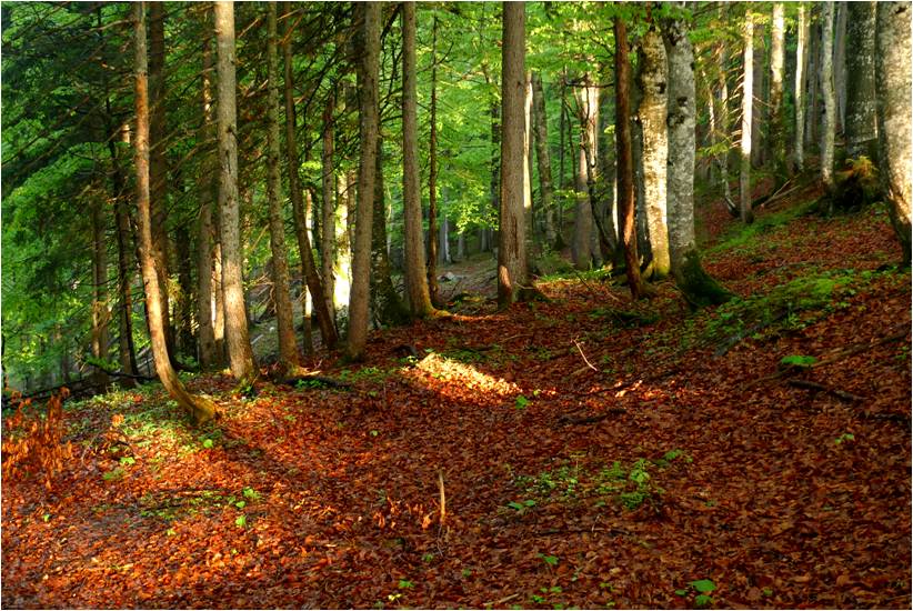 沿着山路走了一个多小时,山越来越高,路越来越烂。再往前,已经没有路了,但树林中的景色越来越美,爬上一道山脊,从对面的云雾中钻出一缕阳光,刹那间把地面的落叶染得通红。