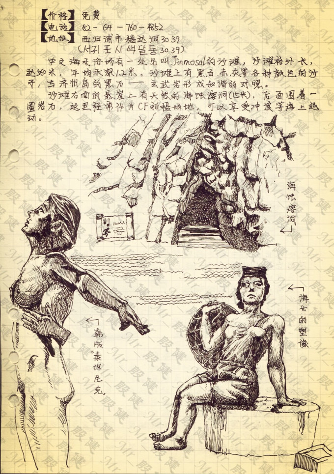 中文海水浴场有一条名叫jinmosal的沙滩,长达560米,沙滩上有黑白赤灰等各种颜色的沙子,与黑石形成和谐的对照,这里常作CF的拍摄场地~