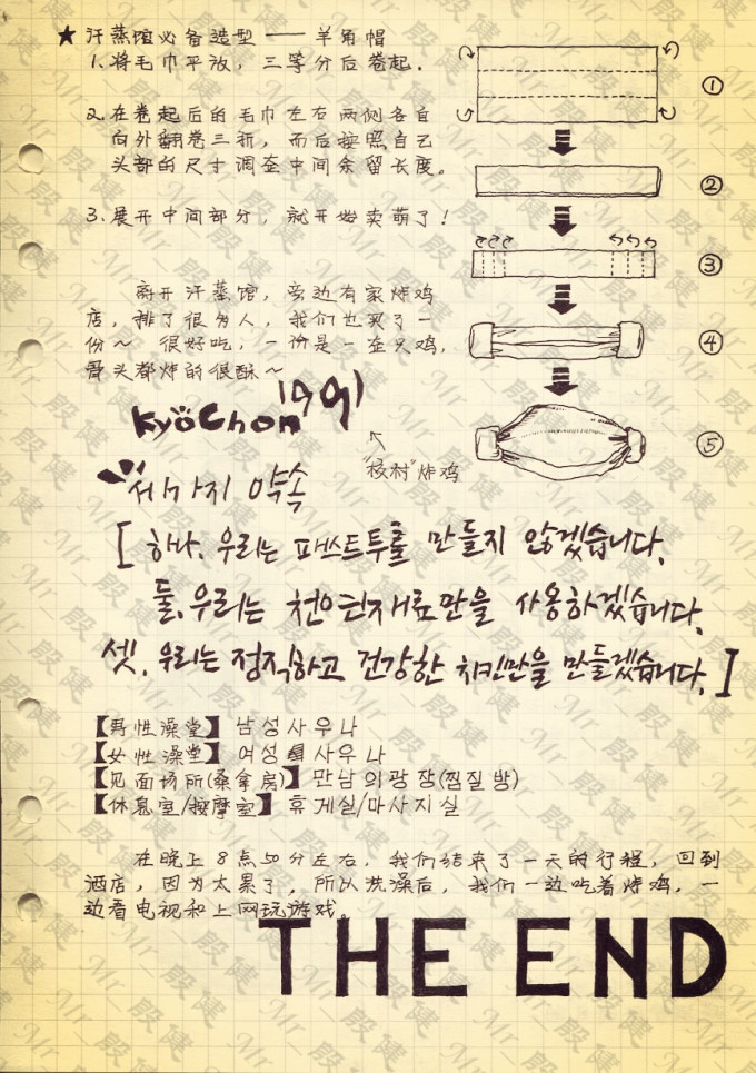 在汗蒸馆里学会了韩剧里流行的“羊角帽”的叠法…外面还有一家校村炸鸡,特别好吃~