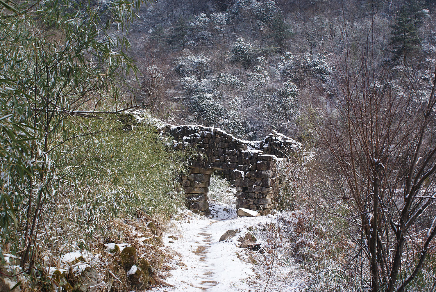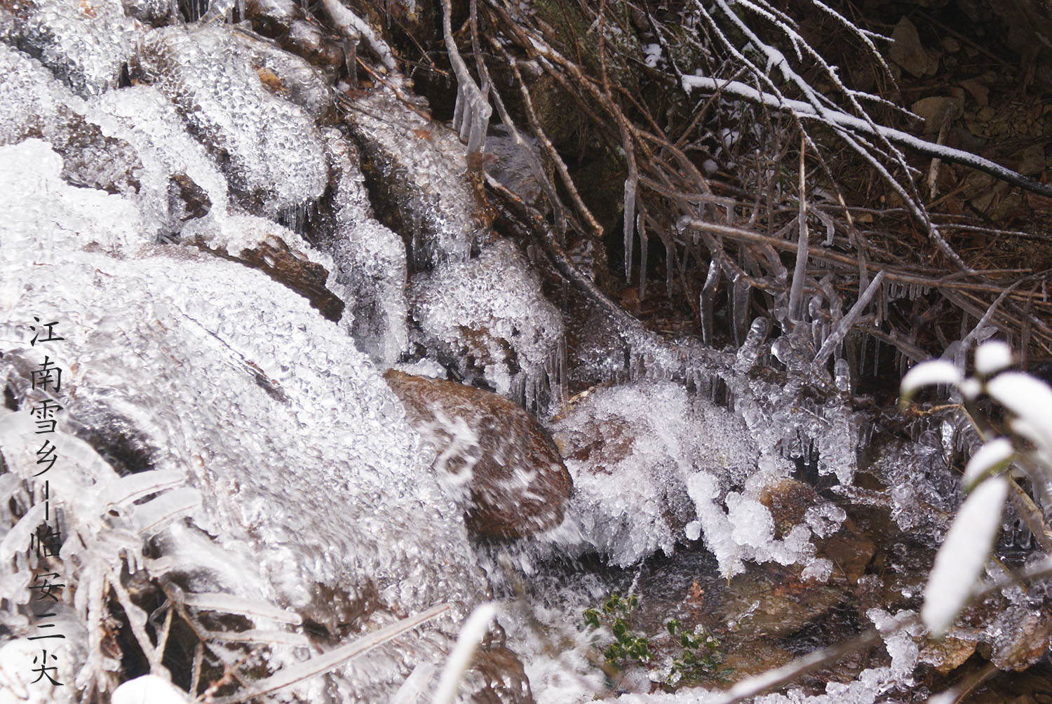 第二天6点半起来吃早餐,7点30出去上溪村,走两昌古道直接上,一下车石板路上有一层积雪,我们穿上冰爪,慢慢的开始一路拍一路爬,大概在下午1点到杜鹃湖,又是一阵拍,2点半下撤回家。下到上溪村都5点半了,雪路不好走。