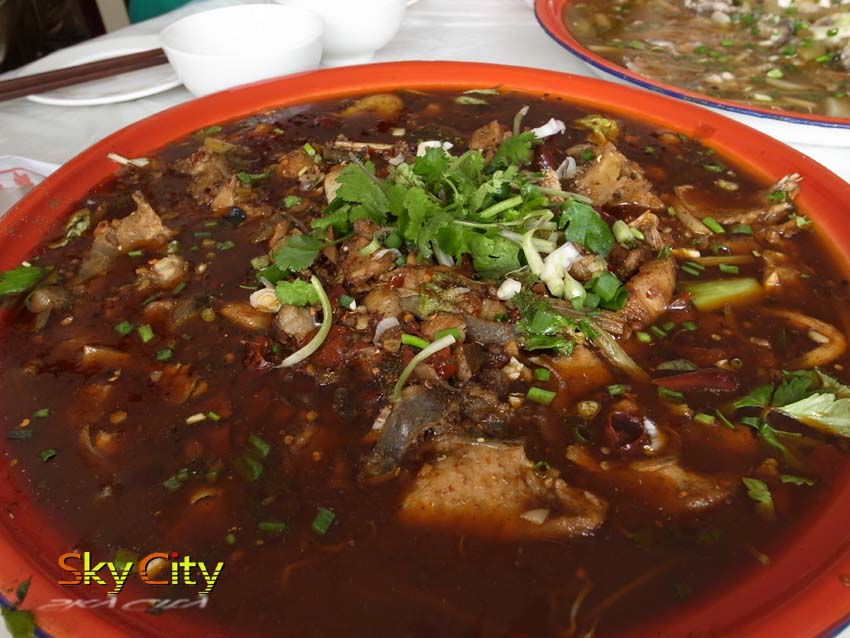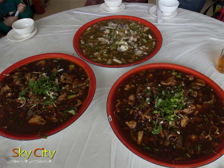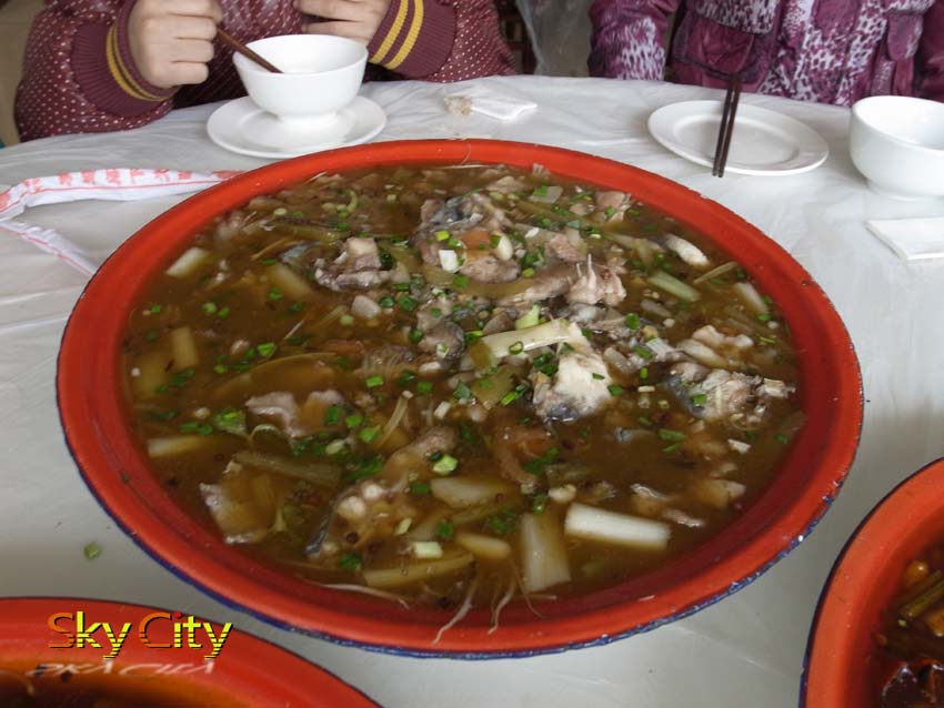 午饭吃的是大盘的鲢鱼,至于什么名称确实没有搞清楚,反正味道是非常的好吃,吃完鱼肉还可以往里面煮一些豆腐和蔬菜。除了鱼,还上了一些回锅肉、烧青菜之类的,味道都很棒,我们基本上是全部消灭掉了。